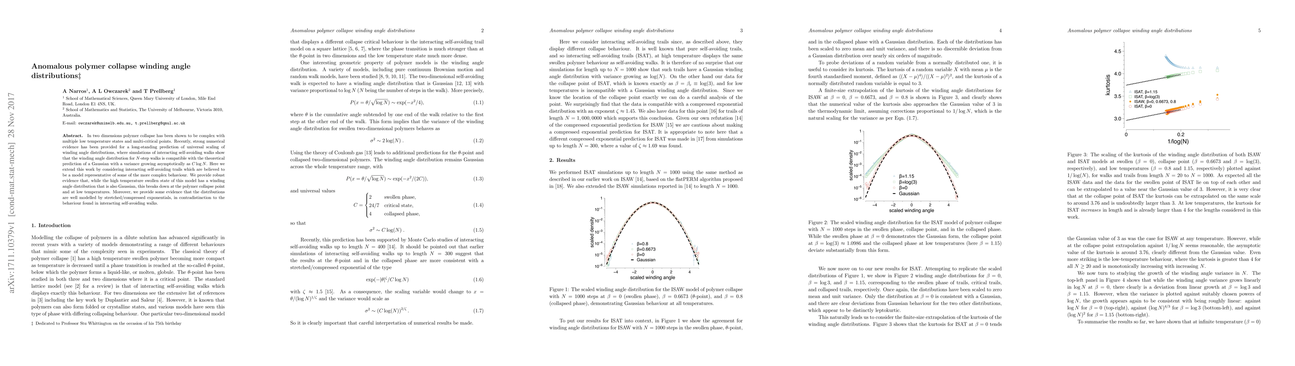 The paper presents robust evidence for non-Gaussian winding angle distributions in interacting self-avoiding trails at the collapse point and low temperatures, suggesting stretched/compressed exponential behavior as an alternative model.
