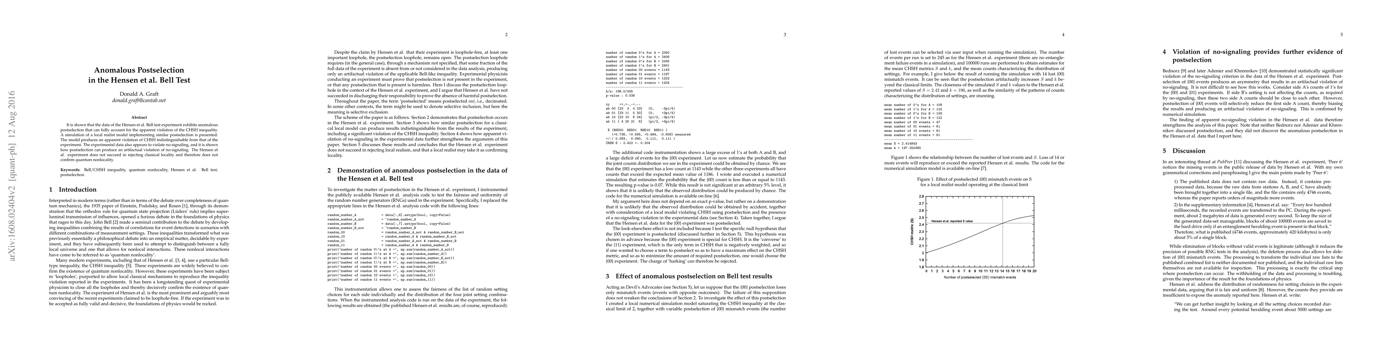 This paper demonstrates that the Hensen et al. Bell test experiment shows anomalous postselection, which can fully explain the apparent violation of the CHSH inequality. A local realist model with similar postselection produces results indistinguishable from the experiment, indicating that the experiment does not confirm quantum nonlocality.