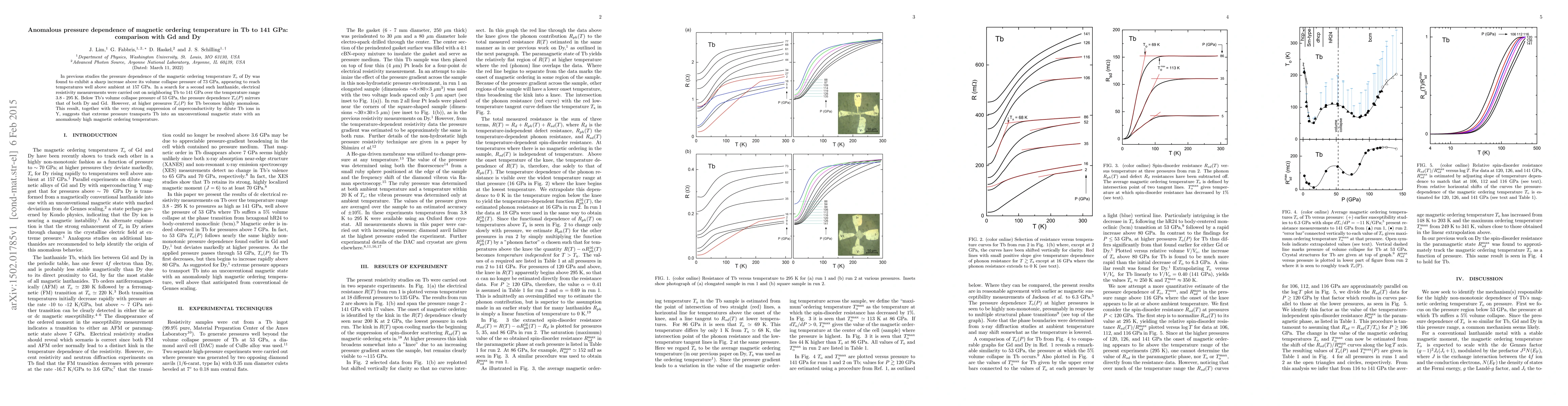 This study investigates the pressure dependence of the magnetic ordering temperature in Tb up to 141 GPa, revealing an anomalous behavior compared to Gd and Dy. At pressures above Tb's volume collapse pressure of 53 GPa, Tb exhibits a highly unusual magnetic ordering temperature, suggesting an unconventional magnetic state.