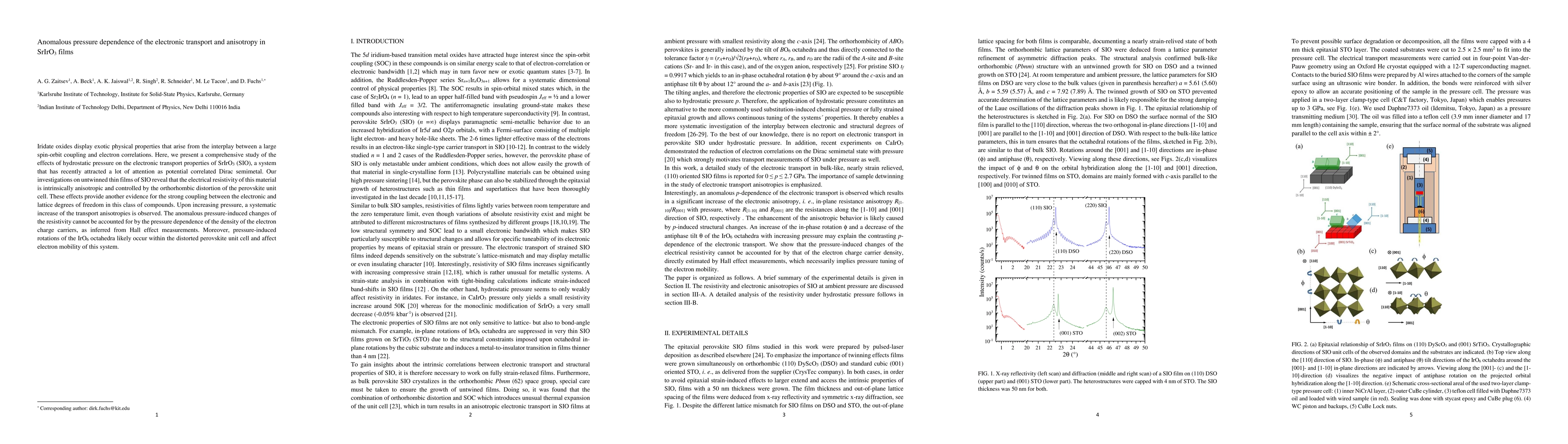 Iridate oxides display exotic physical properties that arise from the interplay between a large spin-orbit coupling and electron correlations. Here, we present a comprehensive study of the effects of hydrostatic pressure on the electronic transport properties of SrIrO3 (SIO), a system that has recently attracted a lot of attention as potential correlated Dirac semimetal. Our investigations on untwinned thin films of SIO reveal that the electrical resistivity of this material is intrinsically anisotropic and controlled by the orthorhombic distortion of the perovskite unit cell. These effects provide another evidence for the strong coupling between the electronic and lattice degrees of freedom in this class of compounds. Upon increasing pressure, a systematic increase of the transport anisotropies is observed. The anomalous pressure-induced changes of the resistivity cannot be accounted for by the pressure dependence of the density of the electron charge carriers, as inferred from Hall effect measurements. Moreover, pressure-induced rotations of the IrO6 octahedra likely occur within the distorted perovskite unit cell and affect electron mobility of this system.