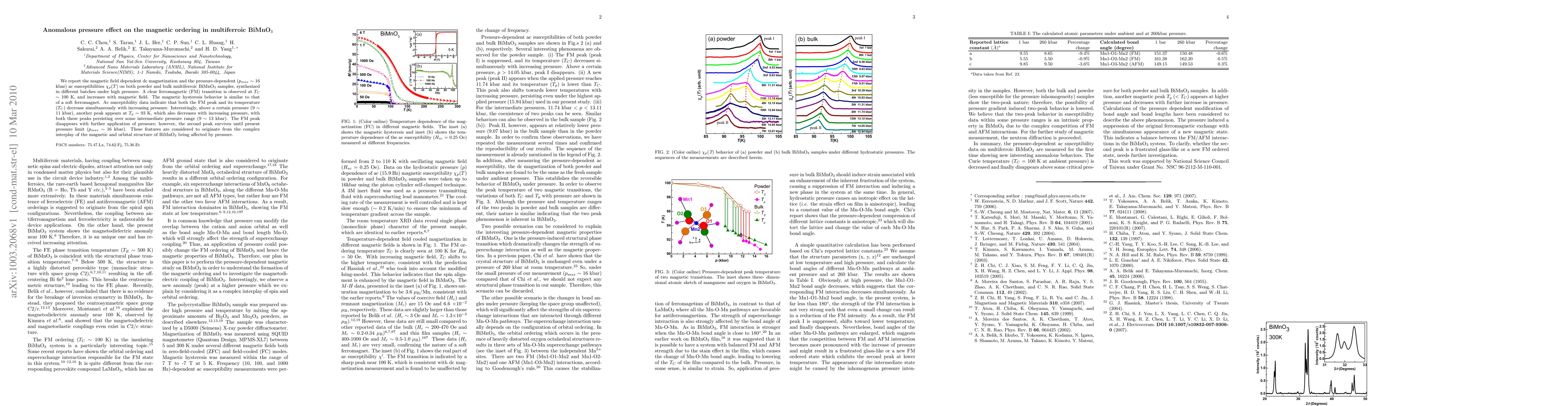 This study investigates the magnetic ordering in multiferroic BiMnO3 under pressure, revealing a ferromagnetic transition at TC ~ 100 K that diminishes with increasing pressure. A secondary peak emerges above 9 kbar and persists up to the maximum pressure of 16 kbar, suggesting a complex interplay between magnetic and orbital structures.