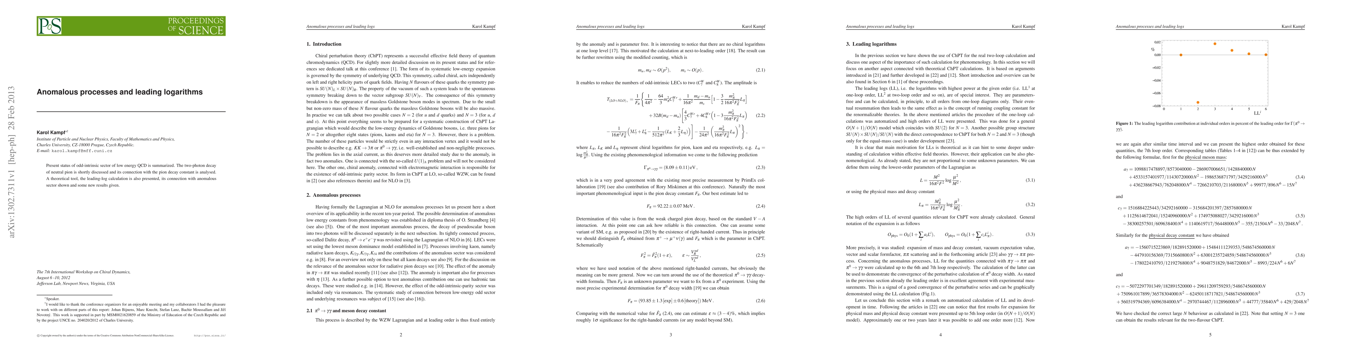 The paper discusses the odd-intrinsic sector of low energy Quantum Chromodynamics (QCD), focusing on the two-photon decay of neutral pion and its relation to the pion decay constant. It introduces leading-log calculations as a theoretical tool, providing new results and linking them to the anomalous sector.