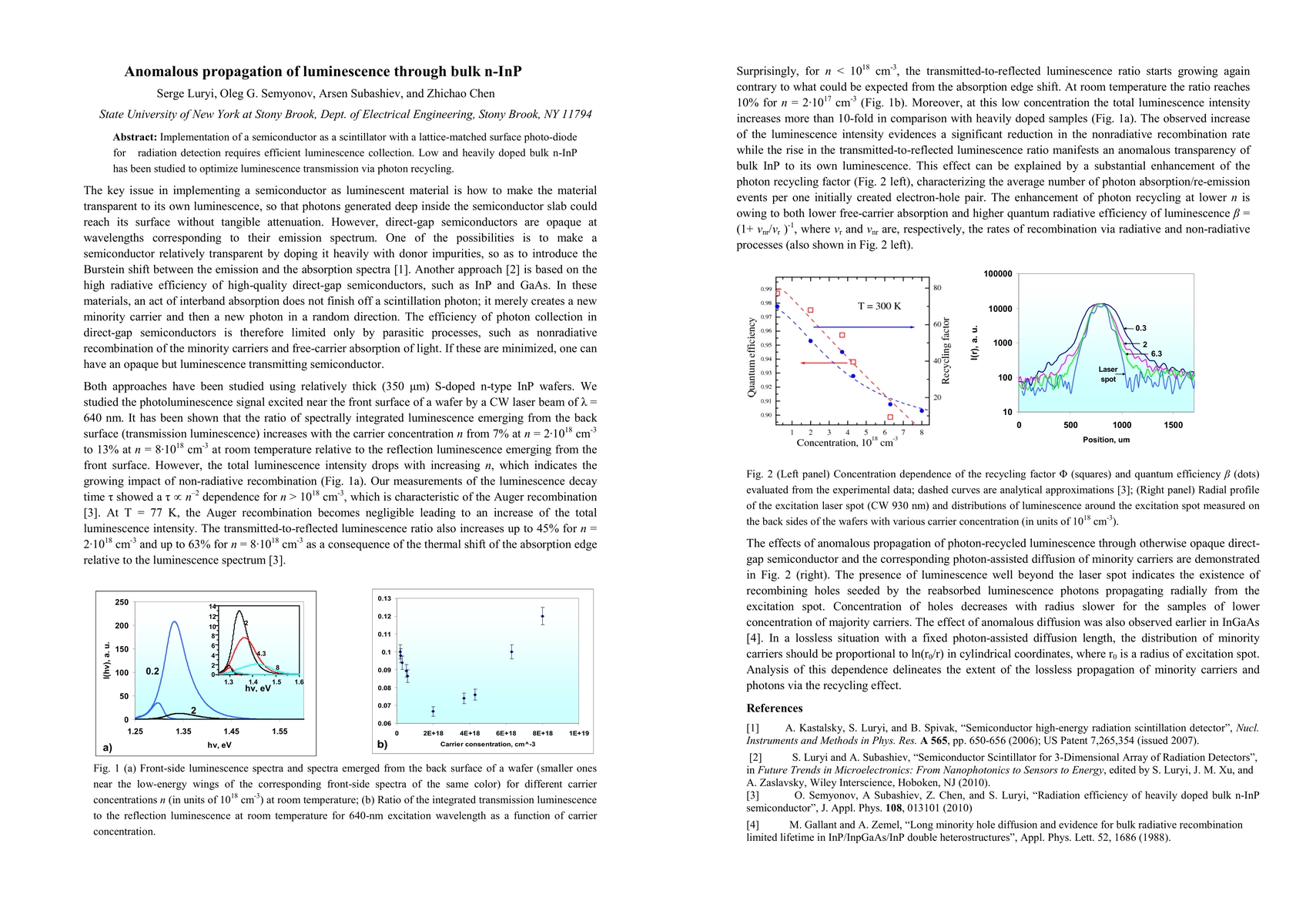 Implementation of a semiconductor as a scintillator with a lattice-matched surface photo-diode for radiation detection requires efficient luminescence collection. Low and heavily doped bulk n-InP has been studied to optimize luminescence transmission via photon recycling.