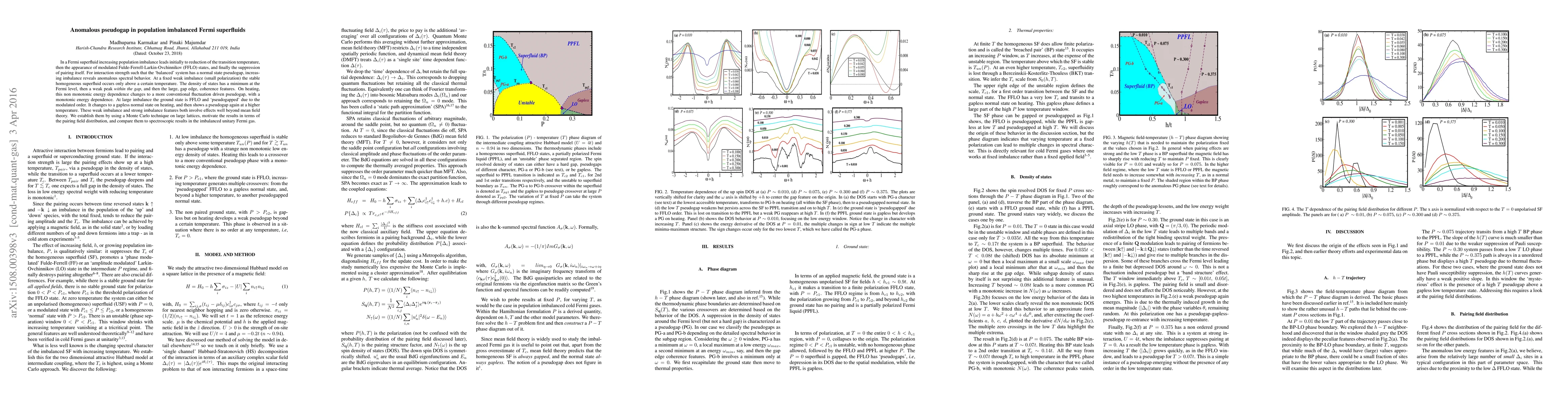 In a Fermi superfluid increasing population imbalance leads initially to reduction of the transition temperature, then the appearance of modulated Fulde-Ferrell-Larkin-Ovchinnikov (FFLO) states, and finally the suppression of pairing itself. For interaction strength such that the `balanced' system has a normal state pseudogap, increasing imbalance reveals anomalous spectral behavior. At a fixed weak imbalance (small polarization) the stable homogeneous superfluid occurs only above a certain temperature. The density of states has a minimum at the Fermi level, then a weak peak {\it within the gap}, and then the large, gap edge, coherence features. On heating, this non monotonic energy dependence changes to a more conventional fluctuation driven pseudogap, with a monotonic energy dependence. At large imbalance the ground state is FFLO and `pseudogapped' due to the modulated order. It changes to a gapless normal state on heating, and then shows a pseudogap again at a higher temperature. These weak imbalance and strong imbalance features both involve effects well beyond mean field theory. We establish them by using a Monte Carlo technique on large lattices, motivate the results in terms of the pairing field distribution, and compare them to spectroscopic results in the imbalanced unitary Fermi gas.