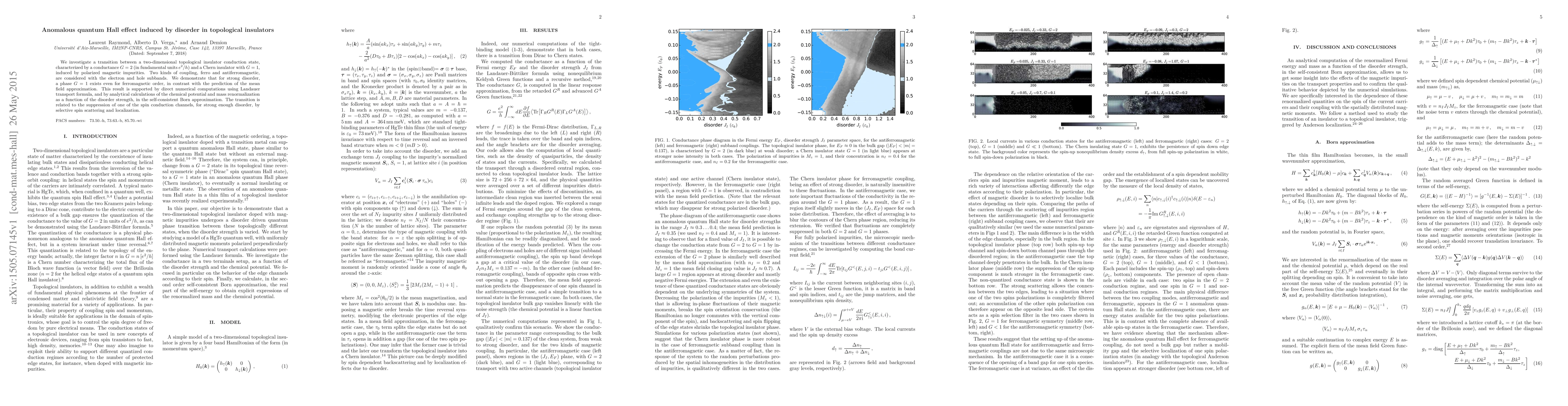 We investigate a transition between a two-dimensional topological insulator conduction state, characterized by a conductance $G=2$ (in fundamental units $e^2/h$) and a Chern insulator with $G=1$, induced by polarized magnetic impurities. Two kinds of coupling, ferro and antiferromagnetic, are considered with the electron and hole subbands. We demonstrate that for strong disorder, a phase $G=1$ exists even for ferromagnetic order, in contrast with the prediction of the mean field approximation. This result is supported by direct numerical computations using Landauer transport formula, and by analytical calculations of the chemical potential and mass renormalization as a function of the disorder strength, in the self-consistent Born approximation. The transition is related to the suppression of one of the spin conduction channels, for strong enough disorder, by selective spin scattering and localization.