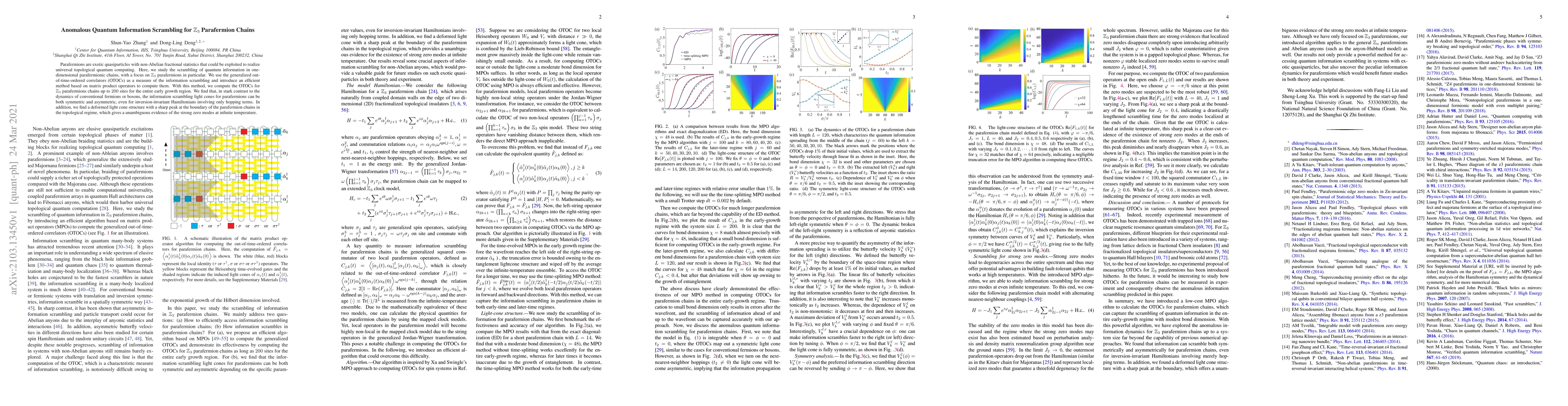 This paper explores quantum information scrambling in one-dimensional $\mathbb{Z}_3$ parafermion chains using generalized out-of-time-ordered correlators (OTOCs). It reveals anomalous scrambling behavior, including asymmetric light cones and a deformed structure with sharp peaks at chain boundaries, indicating strong zero modes in the topological regime.