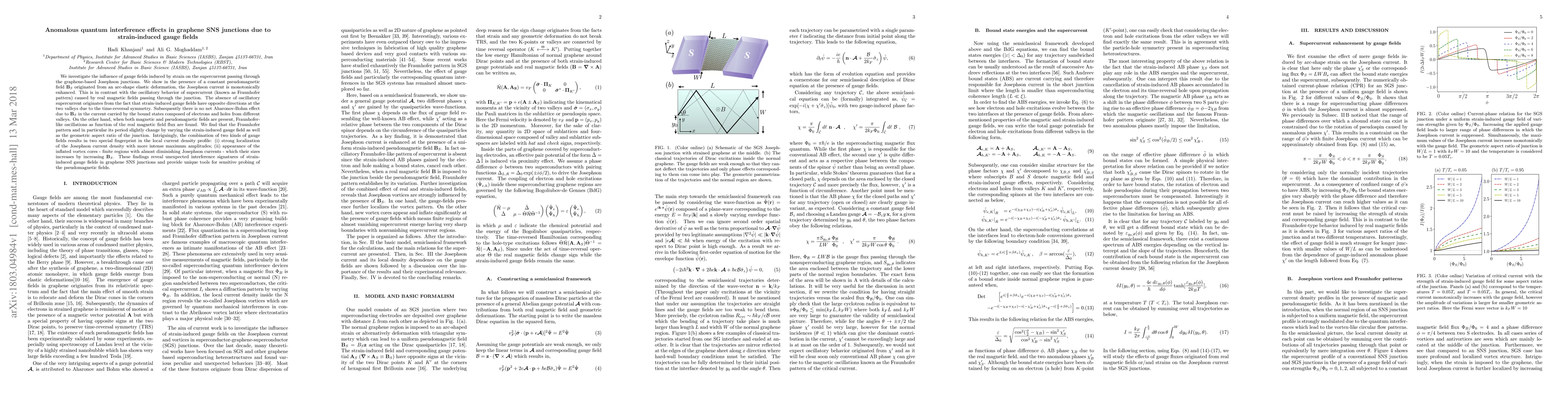 We investigate the influence of gauge fields induced by strain on the supercurrent passing through the graphene-based Josephson junctions. We show in the presence of a constant pseudomagnetic field ${\bf B}_S$ originated from an arc-shape elastic deformation, the Josephson current is monotonically enhanced. This is in contrast with the oscillatory behavior of supercurrent (known as Fraunhofer pattern) caused by real magnetic fields passing through the junction. The absence of oscillatory supercurrent originates from the fact that strain-induced gauge fields have opposite directions at the two valleys due to the time-reversal symmetry. Subsequently there is no net Aharonov-Bohm effect due to ${\bf B}_S$ in the current carried by the bound states composed of electrons and holes from different valleys. On the other hand, when both magnetic and pseudomagnetic fields are present, Fraunhofer-like oscillations as function of the real magnetic field flux are found. We find that the Fraunhofer pattern and in particular its period slightly change by varying the strain-induced gauge field as well as the geometric aspect ratio of the junction. Intriguingly, the combination of two kinds of gauge fields results in two special fingerprint in the local current density profile: (i) strong localization of the Josephson current density with more intense maximum amplitudes; (ii) appearance of the inflated vortex cores - finite regions with almost diminishing Josephson currents - which their sizes increases by increasing ${\bf B}_S$. These findings reveal unexpected interference signatures of strain-induced gauge fields in graphene SNS junctions and provide unique tools for sensitive probing of the pseudomagnetic fields.