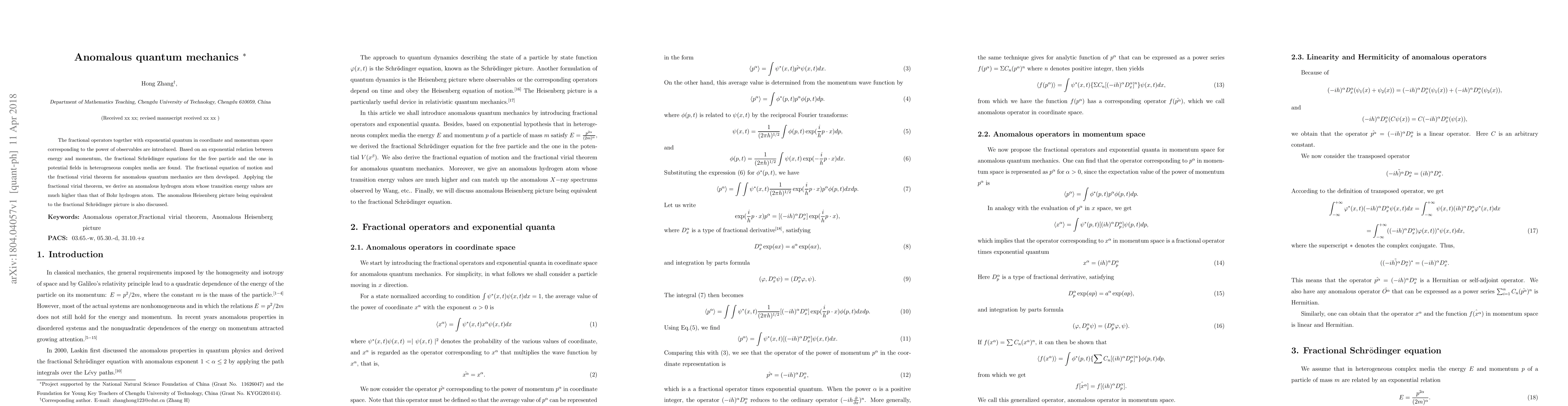 The fractional operators together with exponential quantum in coordinate and momentum space corresponding to the power of observables are introduced. Based on an exponential relation between energy and momentum, the fractional Schr\"odinger equations for the free particle and the one in potential fields in heterogeneous complex media are found. The fractional equation of motion and the fractional virial theorem for anomalous quantum mechanics are then developed. Applying the fractional virial theorem, we derive an anomalous hydrogen atom whose transition energy values are much higher than that of Bohr hydrogen atom. The anomalous Heisenberg picture being equivalent to the fractional Schr\"odinger picture is also discussed.