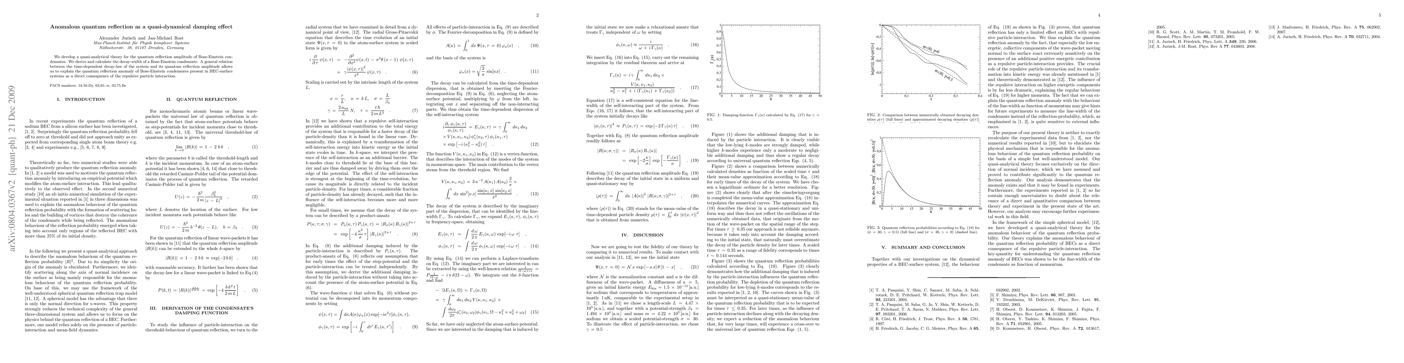 This paper develops a quasi-analytical theory for the quantum reflection amplitude of Bose-Einstein condensates, deriving and calculating the decay-width, and explains the observed quantum reflection anomaly as a quasi-dynamical damping effect due to repulsive particle interactions.