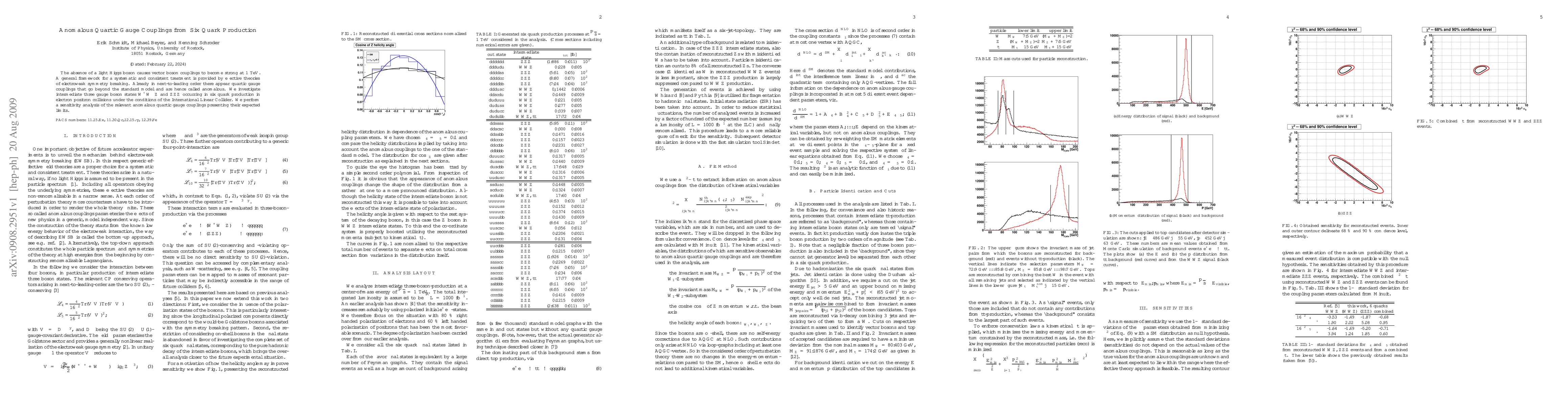 The absence of a light Higgs boson causes vector boson couplings to become strong at 1 TeV. A general framework for a systematic and consistent treatment is provided by effective theories of electroweak symmetry breaking. Already in next-to-leading order there appear quartic gauge couplings that go beyond the standard model and are hence called anomalous. We investigate intermediate three gauge boson states $W^+W^- Z$ and $ZZZ$ occurring in six quark production in electron positron collisions under the conditions of the International Linear Collider. We perform a sensitivity analysis of the relevant anomalous quartic gauge couplings presenting their expected limits.