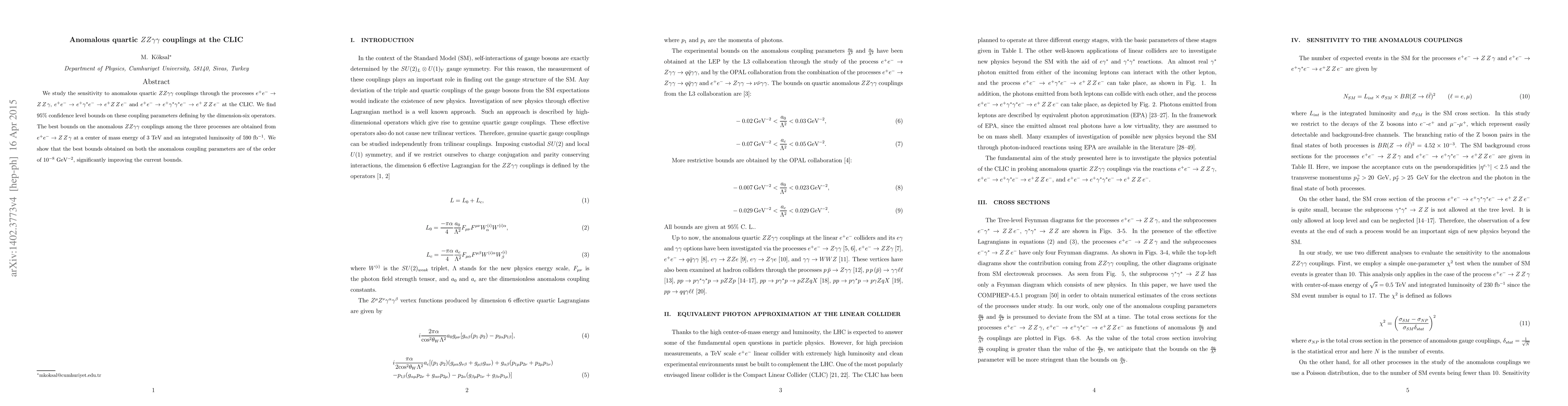 This paper investigates the sensitivity to anomalous quartic $ZZ\gamma\gamma$ couplings at the CLIC collider, finding the best bounds at 3 TeV and 590 fb$^{-1}$ from the $e^{+}e^{-}\rightarrow Z\, Z\, \gamma$ process, improving current limits to $10^{-8}$ GeV$^{-2}$.