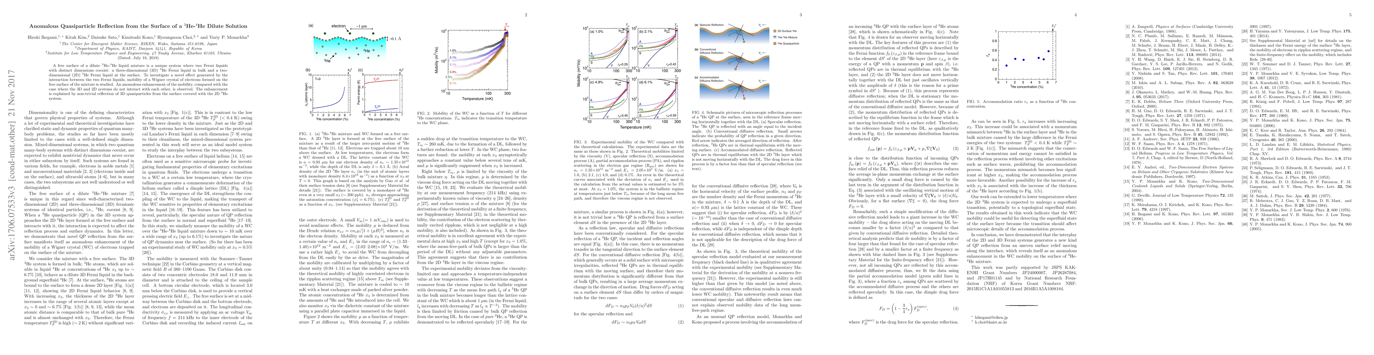 A free surface of a dilute $^3$He-$^4$He liquid mixture is a unique system where two Fermi liquids with distinct dimensions coexist: a three-dimensional (3D) $^3$He Fermi liquid in bulk and a two-dimensional (2D) $^3$He Fermi liquid at the surface. To investigate a novel effect generated by the interaction between the two Fermi liquids, mobility of a Wigner crystal of electrons formed on the free surface of the mixture is studied. An anomalous enhancement of the mobility, compared with the case where the 3D and 2D systems do not interact with each other, is observed. The enhancement is explained by non-trivial reflection of 3D quasiparticles from the surface covered with the 2D $^3$He system.