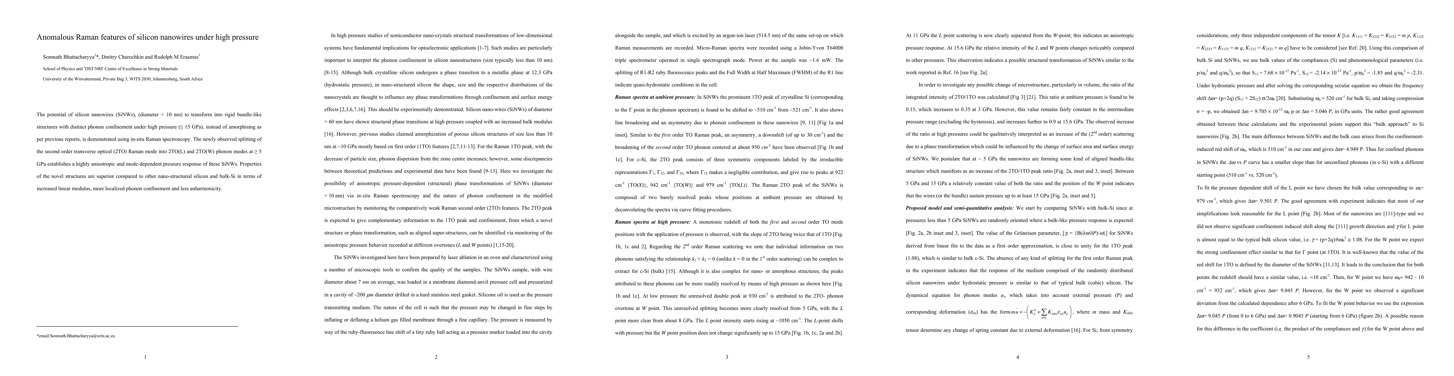 This study reveals that silicon nanowires transform into rigid, bundle-like structures under high pressure, exhibiting unique phonon confinement and splitting of the 2TO Raman mode, indicating an anisotropic pressure response. These novel structures show superior mechanical and phonon properties compared to other silicon forms.