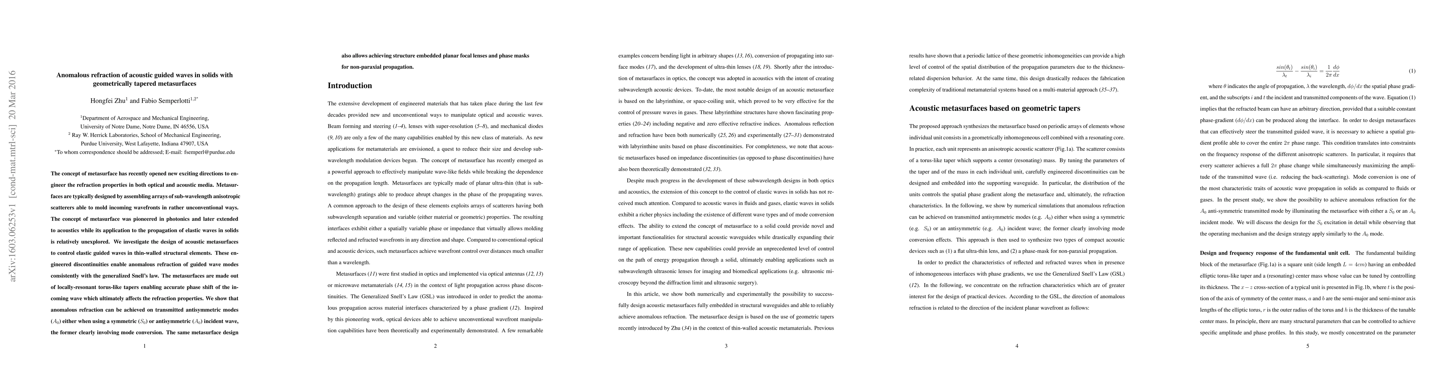 This paper explores the design of acoustic metasurfaces using torus-like tapers to engineer anomalous refraction of guided elastic waves in solids, achieving mode conversion and demonstrating potential for planar focal lenses and phase masks. The study extends metasurface concepts from optics to acoustics for applications in thin-walled structural elements.