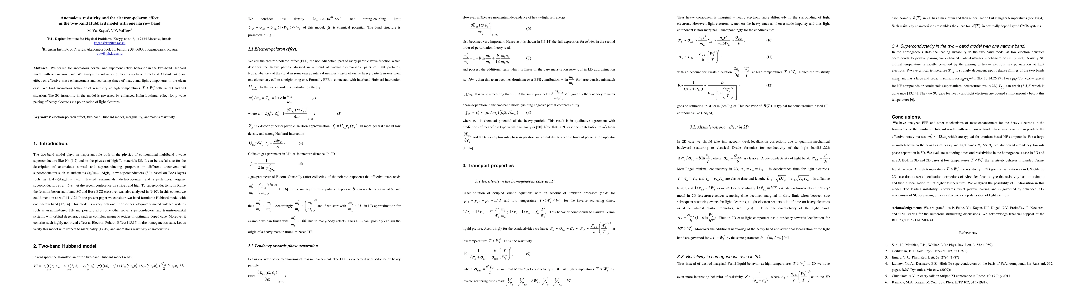 This research investigates anomalous resistivity and electron-polaron effect in a two-band Hubbard model with one narrow band. Key findings include anomalous resistivity at high temperatures in 3D and 2D, and superconductivity governed by enhanced Kohn-Luttinger effect for p-wave pairing of heavy electrons via light electron polarization.