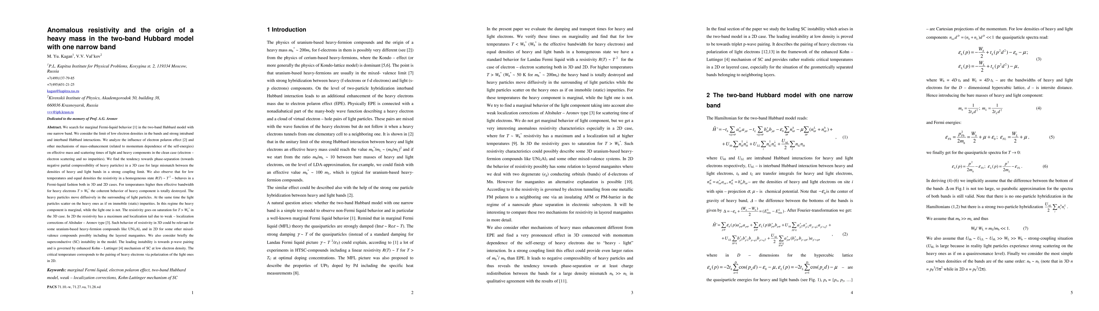Researchers investigate the two-band Hubbard model with a narrow band, finding that at low electron densities and strong interactions, heavy particles exhibit anomalous behavior, leading to phase separation and resistivity saturation in 3D cases, relevant to uranium-based heavy-fermion compounds.