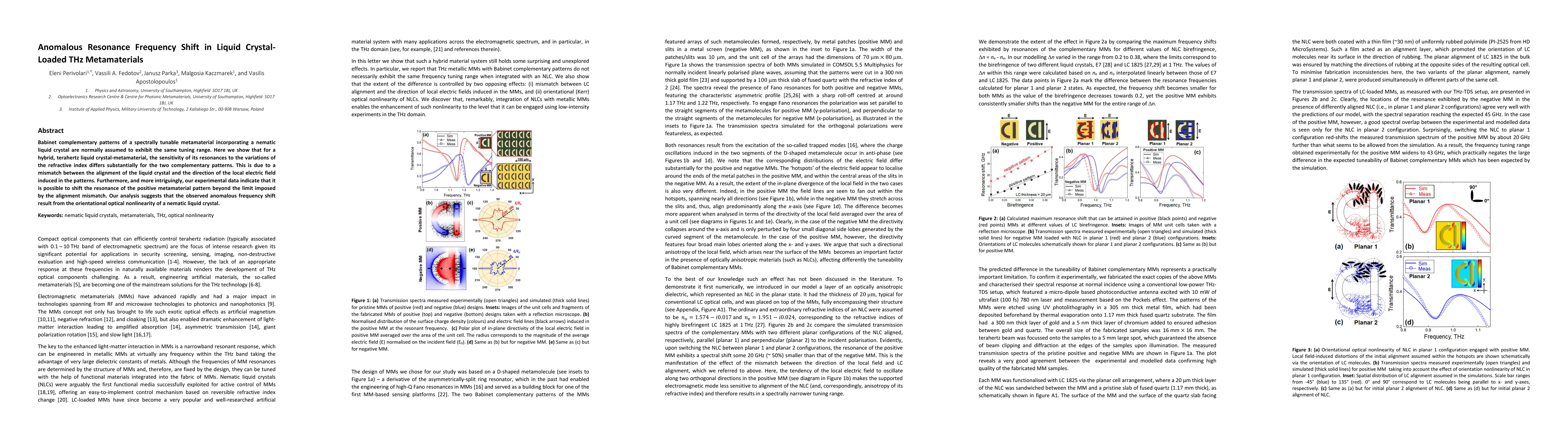 Babinet complementary patterns of a spectrally tunable metamaterial incorporating a nematic liquid crystal are normally assumed to exhibit the same tuning range. Here we show that for a hybrid, terahertz liquid crystal-metamaterial, the sensitivity of its resonances to the variations of the refractive index differs substantially for the two complementary patterns. This is due to a mismatch between the alignment of the liquid crystal and the direction of the local electric field induced in the patterns. Furthermore, and more intriguingly, our experimental data indicate that it is possible to shift the resonance of the positive metamaterial pattern beyond the limit imposed by the alignment mismatch. Our analysis suggests that the observed anomalous frequency shift result from the orientational optical nonlinearity of a nematic liquid crystal.