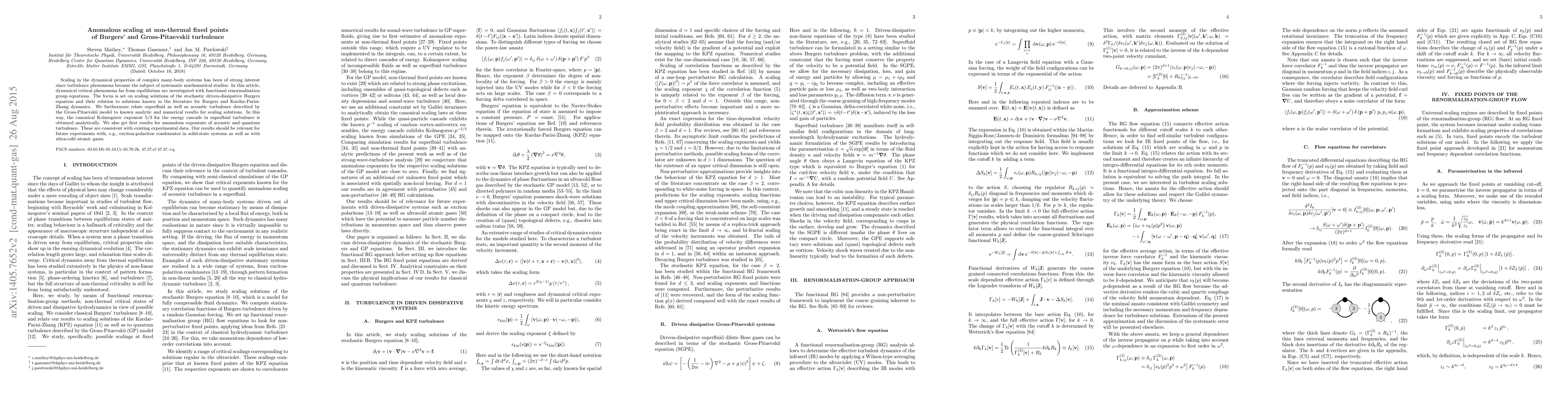 Scaling in the dynamical properties of complex many-body systems has been of strong interest since turbulence phenomena became the subject of systematic mathematical studies. In this article, dynamical critical phenomena far from equilibrium are investigated with functional renormalisation group equations. The focus is set on scaling solutions of the stochastic driven-dissipative Burgers equation and their relation to solutions known in the literature for Burgers and Kardar-Parisi-Zhang dynamics. We furthermore relate superfluid as well as acoustic turbulence described by the Gross-Pitaevskii model to known analytic and numerical results for scaling solutions. In this way, the canonical Kolmogorov exponent 5/3 for the energy cascade in superfluid turbulence is obtained analytically. We also get first results for anomalous exponents of acoustic and quantum turbulence. These are consistent with existing experimental data. Our results should be relevant for future experiments with, e.g., exciton-polariton condensates in solid-state systems as well as with ultra-cold atomic gases.