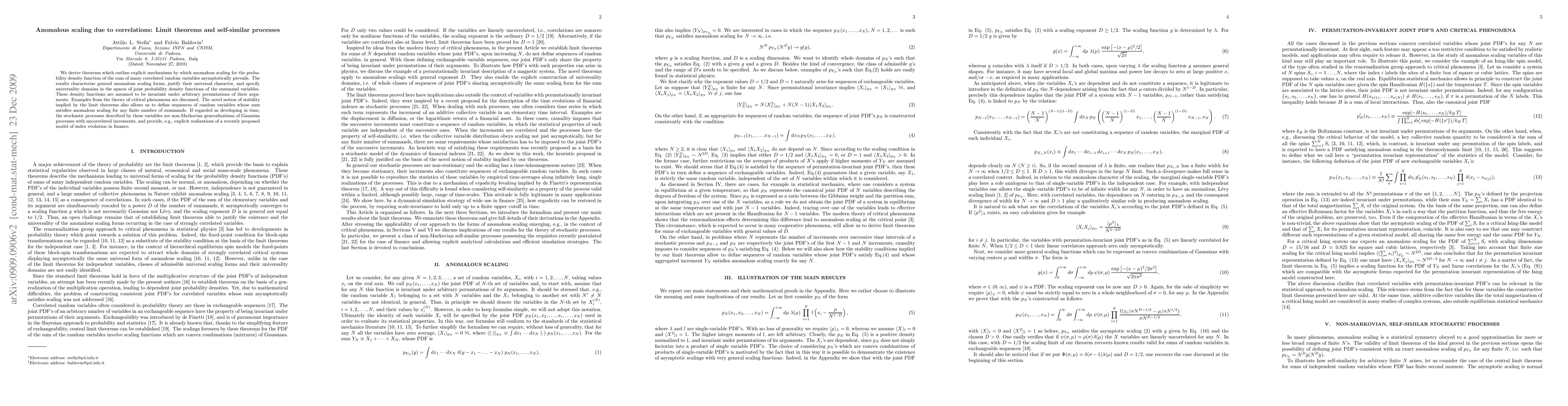 We derive theorems which outline explicit mechanisms by which anomalous scaling for the probability density function of the sum of many correlated random variables asymptotically prevails. The results characterize general anomalous scaling forms, justify their universal character, and specify universality domains in the spaces of joint probability density functions of the summand variables. These density functions are assumed to be invariant under arbitrary permutations of their arguments. Examples from the theory of critical phenomena are discussed. The novel notion of stability implied by the limit theorems also allows us to define sequences of random variables whose sum satisfies anomalous scaling for any finite number of summands. If regarded as developing in time, the stochastic processes described by these variables are non-Markovian generalizations of Gaussian processes with uncorrelated increments, and provide, e.g., explicit realizations of a recently proposed model of index evolution in finance.