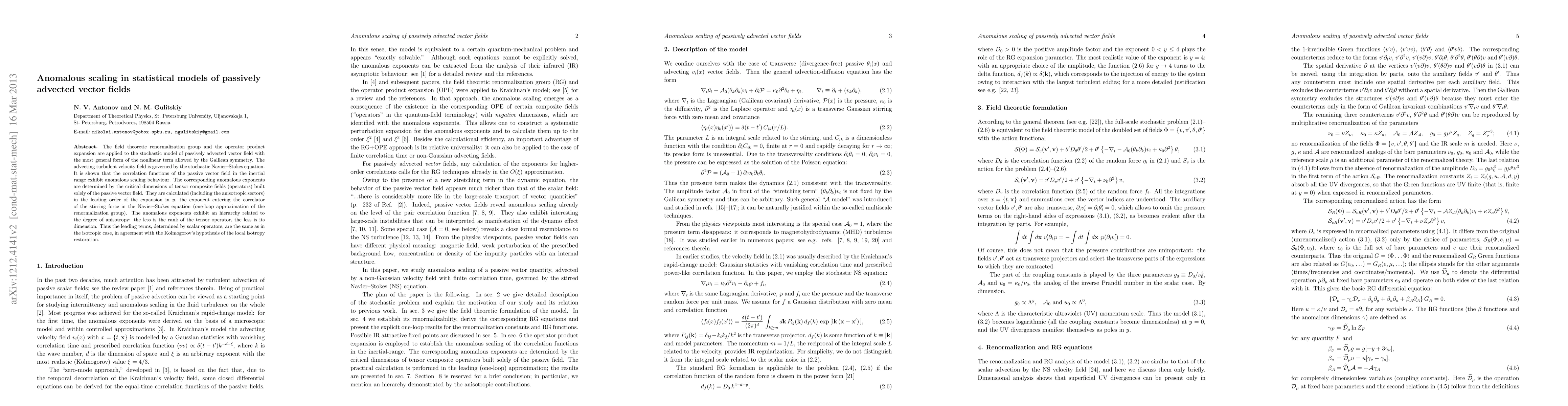 This paper applies field theory methods to study a stochastic model of passively advected vector fields in turbulence, revealing anomalous scaling behavior in the inertial range. The anomalous exponents are determined by the critical dimensions of tensor composite fields, showing an anisotropy hierarchy where lower-rank tensors have lower dimensions, aligning with Kolmogorov's hypothesis of local isotropy restoration.