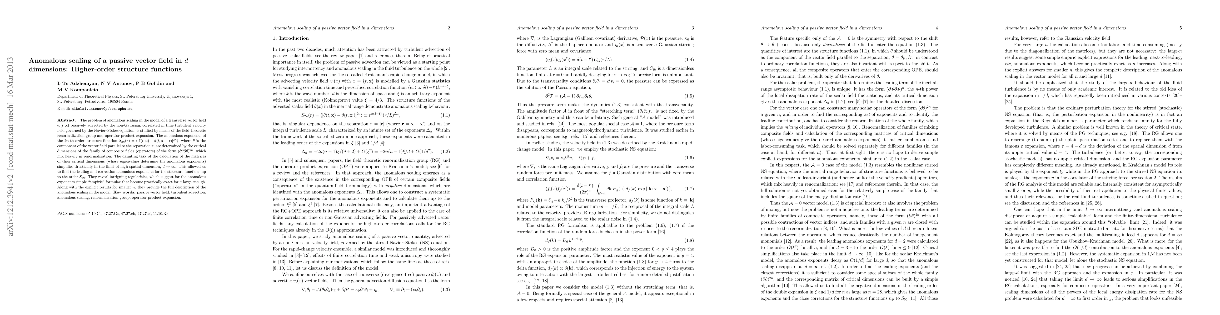 This paper investigates anomalous scaling in a passive vector field $\theta_{i}(t,x)$ advected by turbulent velocity fields using field-theoretic renormalization group methods. It determines the anomalous exponents of higher-order structure functions $S_{2n}(r)$ and finds regularities suggesting simple empirical formulas for these exponents in high dimensions.