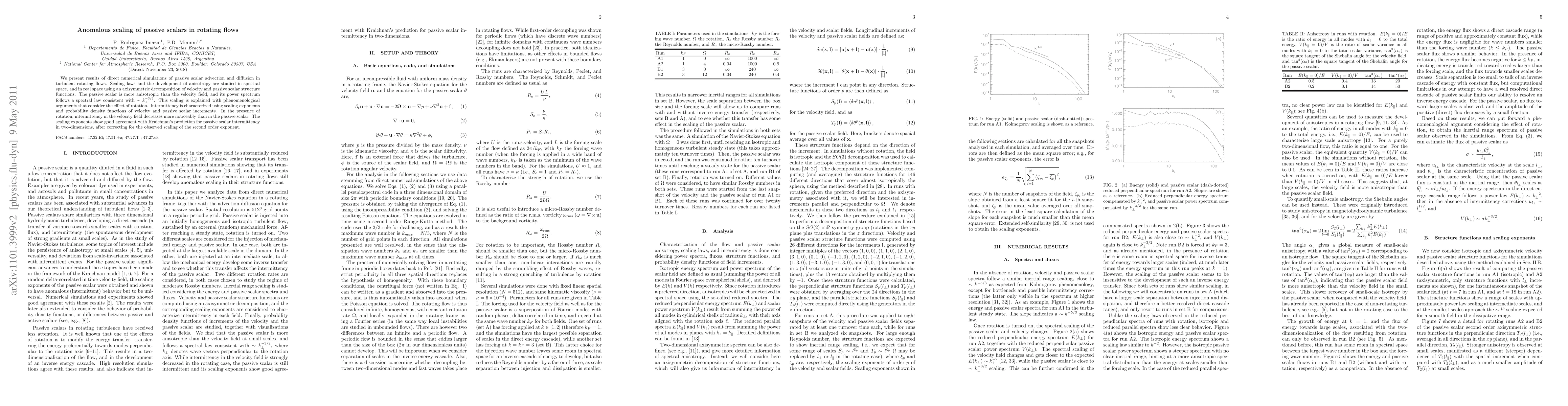 This paper investigates passive scalar advection in turbulent rotating flows through direct numerical simulations, revealing anisotropic scaling laws and intermittency. The scalar's power spectrum follows a $\sim k_\perp^{-3/2}$ scaling, explained by rotation effects, while intermittency in the scalar is less affected by rotation compared to the velocity field.