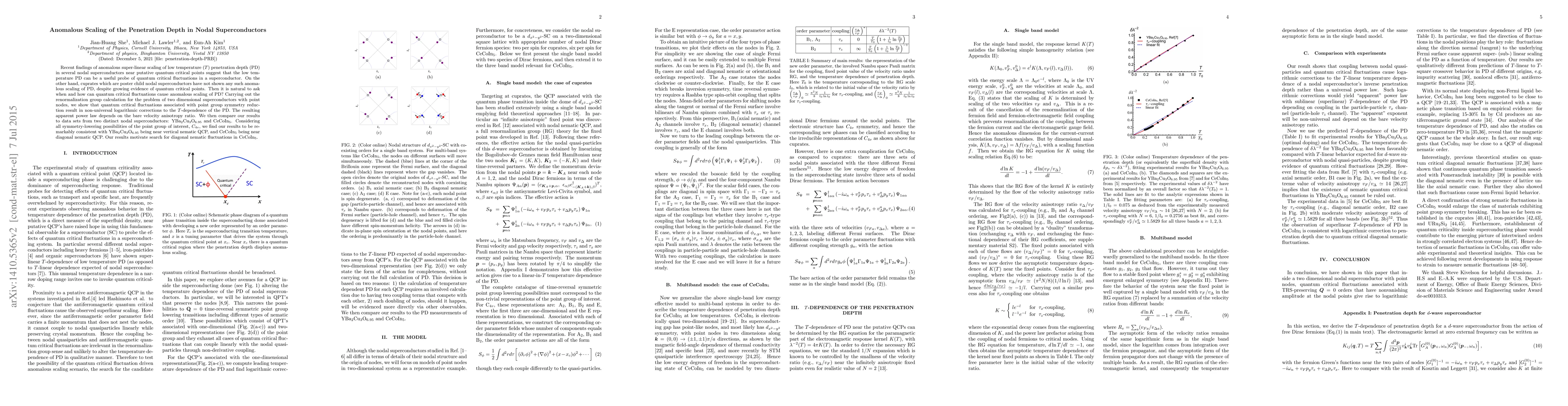 This paper investigates the anomalous super-linear scaling of penetration depth in nodal superconductors near quantum critical points, revealing non-universal logarithmic corrections due to quantum critical fluctuations. The study finds that YBa$_2$Cu$_3$O$_{6.95}$ is near a vertical nematic quantum critical point, while CeCoIn$_5$ is near a diagonal nematic QCP, motivating further research into diagonal nematic fluctuations.