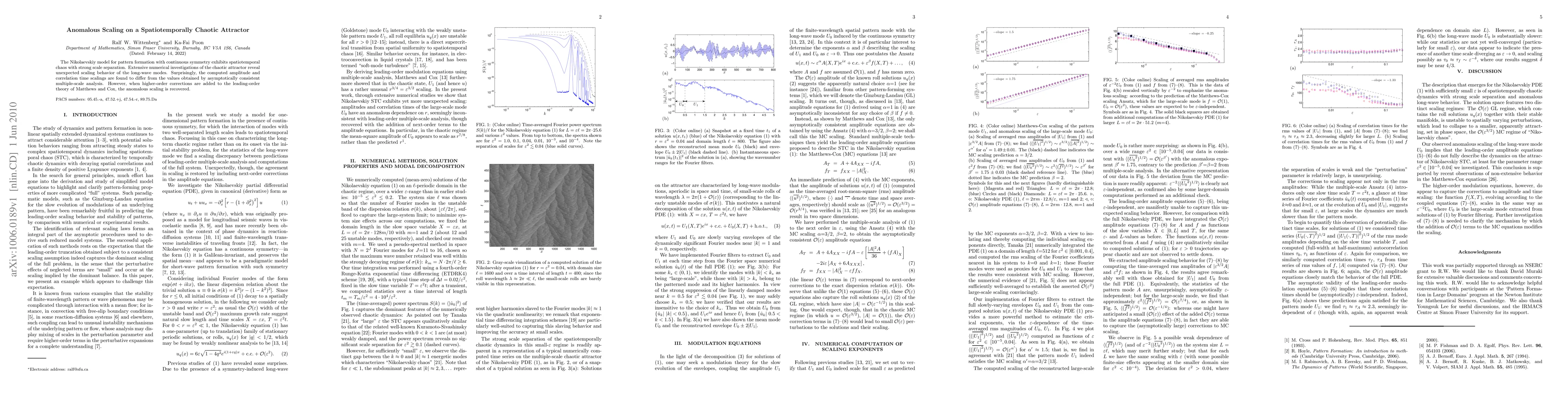 The Nikolaevskiy model for pattern formation with continuous symmetry exhibits spatiotemporal chaos with strong scale separation. Extensive numerical investigations of the chaotic attractor reveal unexpected scaling behavior of the long-wave modes. Surprisingly, the computed amplitude and correlation time scalings are found to differ from the values obtained by asymptotically consistent multiple-scale analysis. However, when higher-order corrections are added to the leading-order theory of Matthews and Cox, the anomalous scaling is recovered.