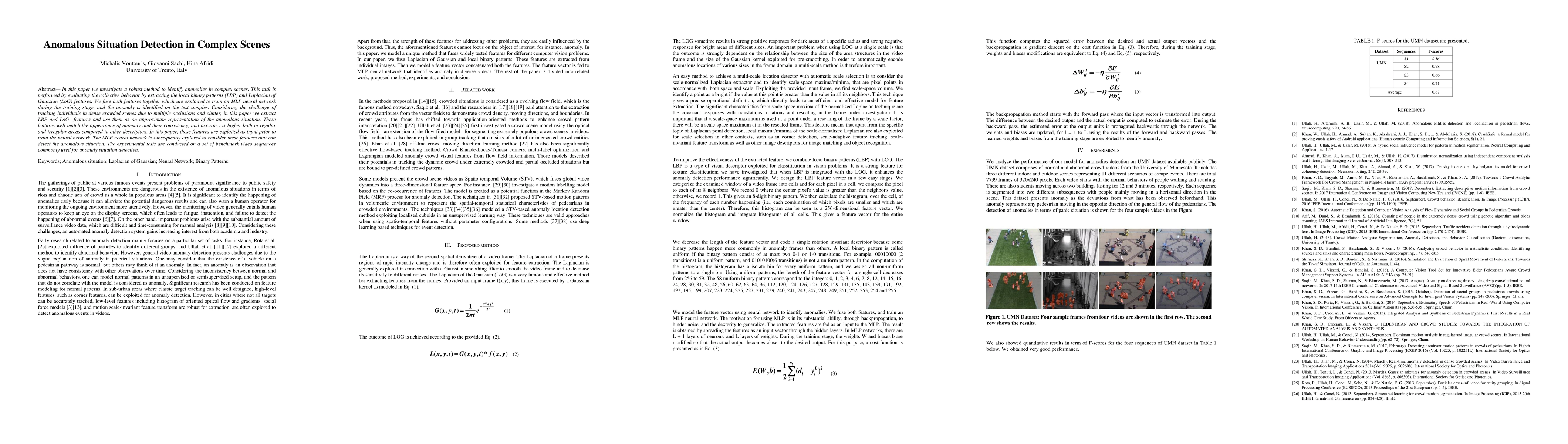 In this paper we investigate a robust method to identify anomalies in complex scenes. This task is performed by evaluating the collective behavior by extracting the local binary patterns (LBP) and Laplacian of Gaussian (LoG) features. We fuse both features together which are exploited to train an MLP neural network during the training stage, and the anomaly is identified on the test samples. Considering the challenge of tracking individuals in dense crowded scenes due to multiple occlusions and clutter, in this paper we extract LBP and LoG features and use them as an approximate representation of the anomalous situation. These features well match the appearance of anomaly and their consistency, and accuracy is higher both in regular and irregular areas compared to other descriptors. In this paper, these features are exploited as input prior to train the neural network. The MLP neural network is subsequently explored to consider these features that can detect the anomalous situation. The experimental tests are conducted on a set of benchmark video sequences commonly used for anomaly situation detection.
