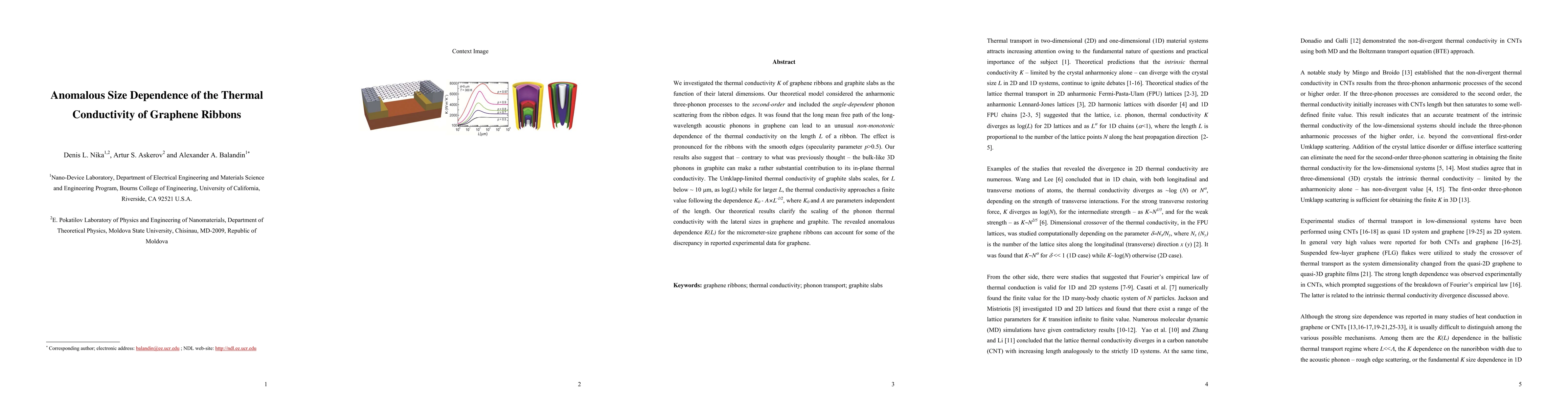The study elucidates the non-monotonic dependence of thermal conductivity in graphene ribbons on their lateral dimensions, revealing that long-wavelength phonons cause unusual scaling effects. It also highlights a significant contribution from bulk-like 3D phonons in graphite's in-plane thermal conductivity, with thermal conductivity scaling logarithmically for small ribbons and inversely proportional to the square root of length for larger ones.