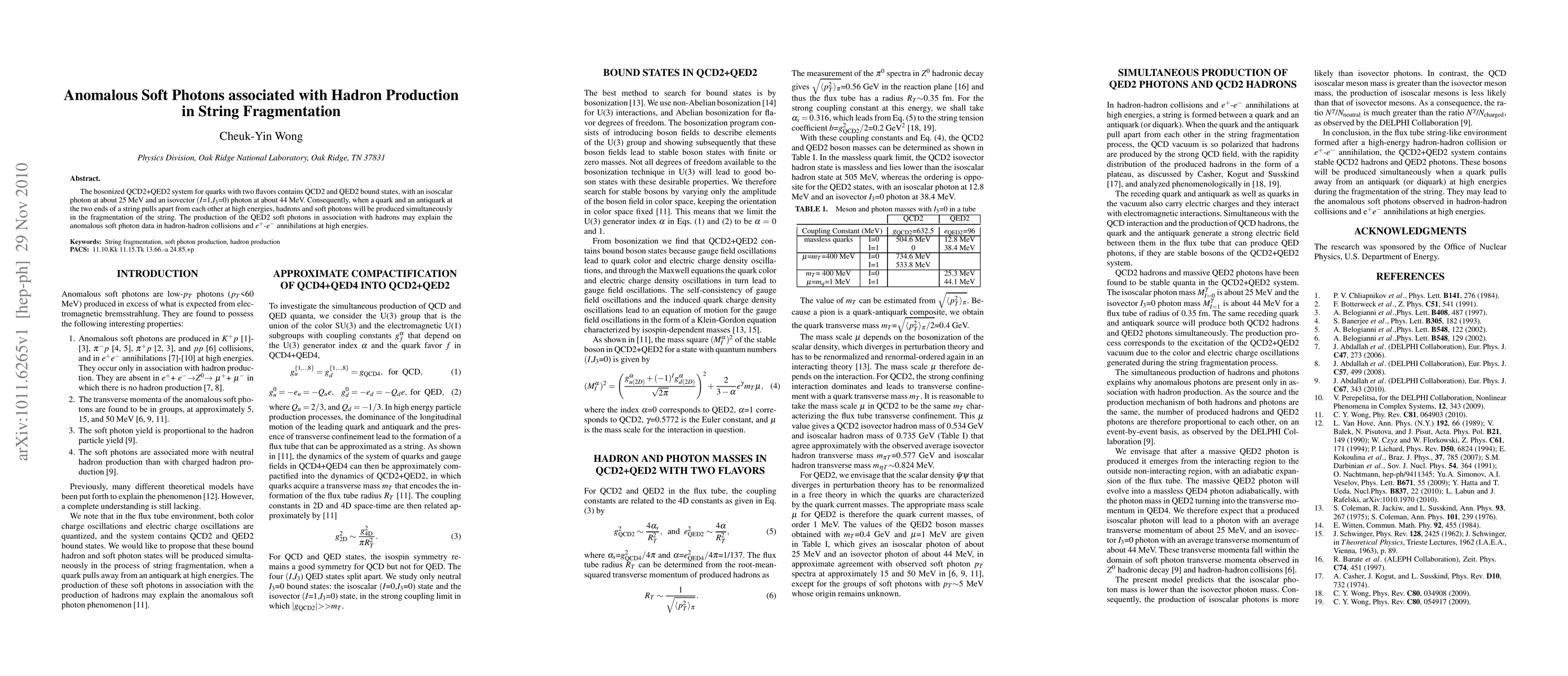 The bosonized QCD2+QED2 system for quarks with two flavors contains QCD2 and QED2 bound states, with an isoscalar photon at about 25 MeV and an isovector (I=1,I_3=0) photon at about 44 MeV. Consequently, when a quark and an antiquark at the two ends of a string pulls apart from each other at high energies, hadrons and soft photons will be produced simultaneously in the fragmentation of the string. The production of the QED2 soft photons in association with hadrons may explain the anomalous soft photon data in hadron-hadron collisions and e+e- annihilations at high energies.