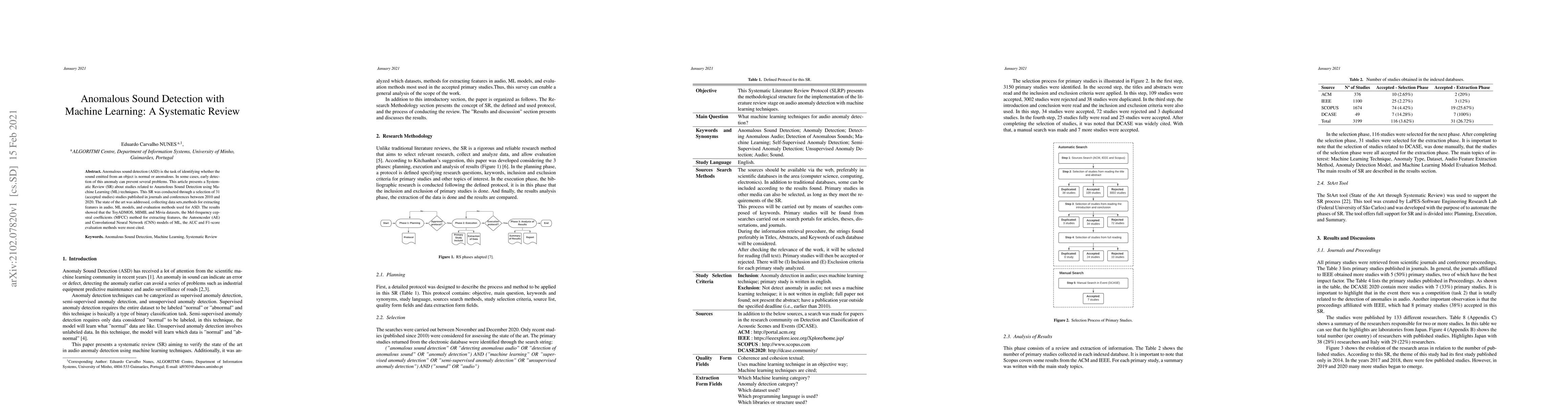 Here's a concise summary of the research paper: This systematic review examines studies on anomalous sound detection using machine learning techniques, focusing on datasets, feature extraction methods, machine learning models, and evaluation metrics. The review highlights the most cited datasets, feature extraction methods, machine learning models, and evaluation metrics used in the field.