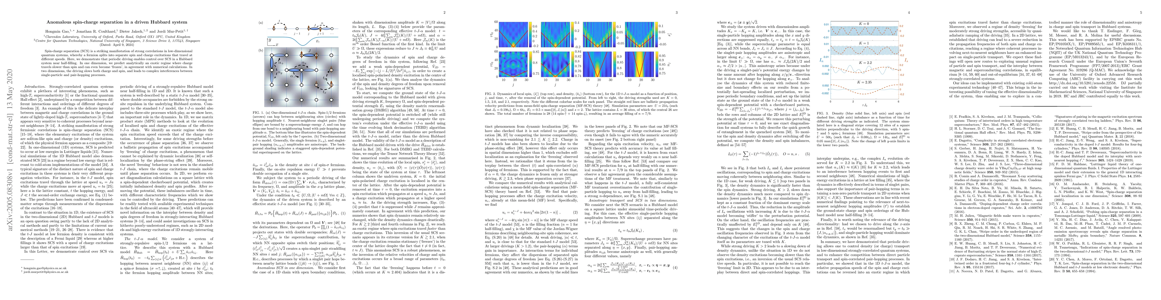 This paper investigates how periodic driving influences spin-charge separation in a driven Hubbard system, revealing an anomalous regime in one dimension where charge moves slower than spin, potentially freezing, and complex interference effects in two dimensions. Analytical predictions are corroborated by numerical simulations.