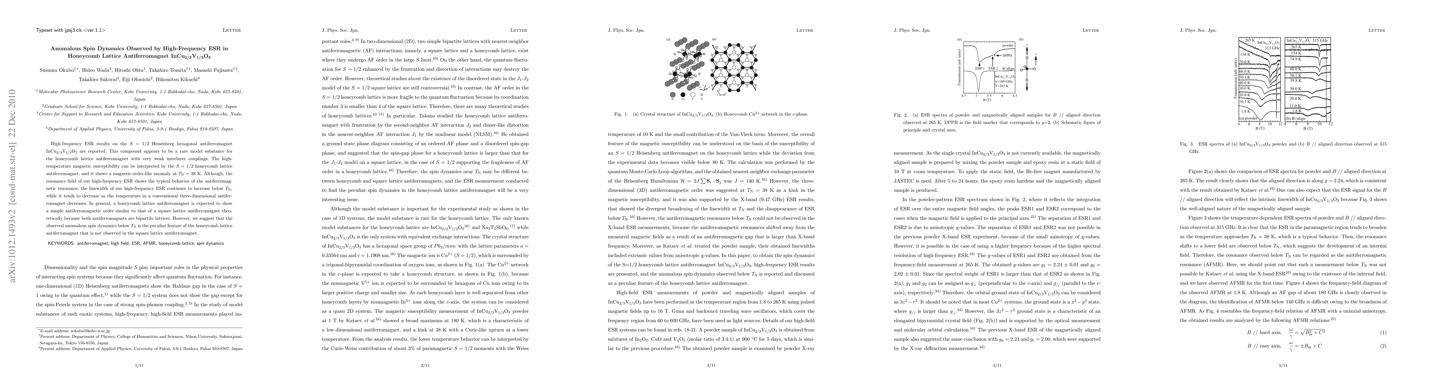 High-frequency ESR on InCu2/3V1/3O3 reveals anomalous spin dynamics below its Néel temperature, challenging the expected simple antiferromagnetic order typical of honeycomb lattice antiferromagnets. The observed increase in ESR linewidth below TN suggests unique spin behavior distinct from conventional three-dimensional antiferromagnets.