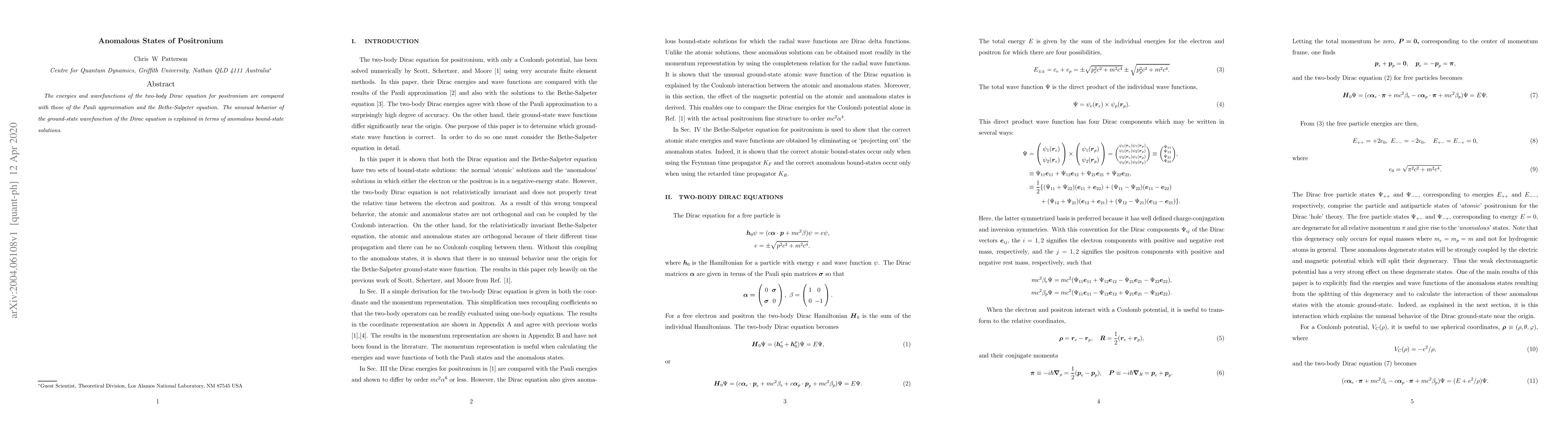 The energies and wave functions of the two-body Dirac equation for positronium are compared with those of the Pauli approximation and the Bethe-Salpeter equation. The unusual behavior of the ground-state wave function of the Dirac equation is explained in terms of anomalous bound-state solutions.