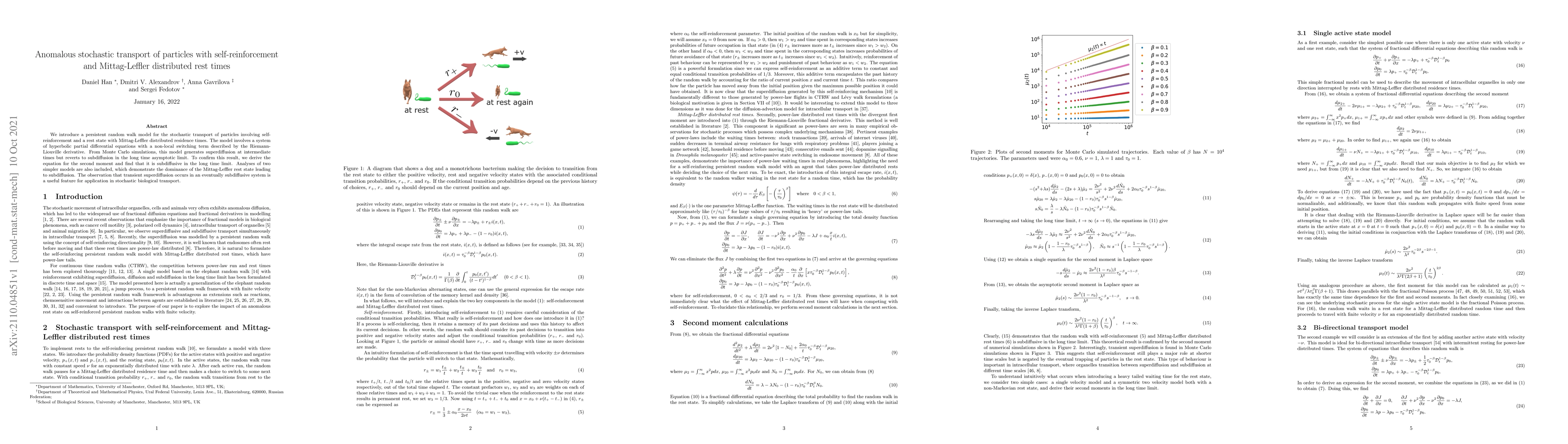 This paper proposes a random walk model for particle transport featuring self-reinforcement and Mittag-Leffler distributed rest times, showing transient superdiffusion followed by long-term subdiffusion. The model's behavior is confirmed through derived equations and Monte Carlo simulations, highlighting its potential for applications in stochastic biological transport.