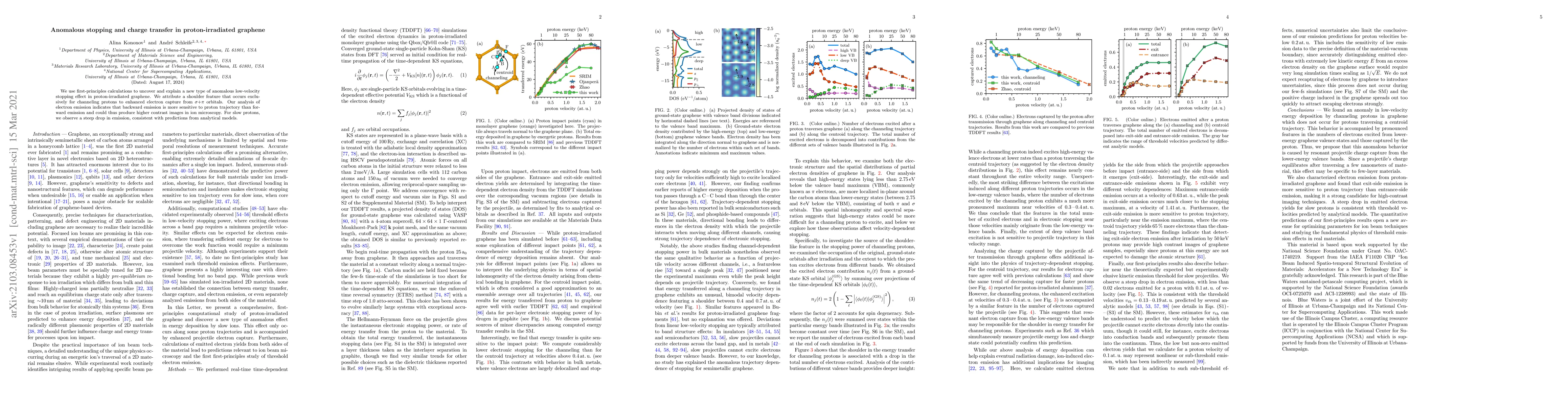 We use first-principles calculations to uncover and explain a new type of anomalous low-velocity stopping effect in proton-irradiated graphene. We attribute a shoulder feature that occurs exclusively for channeling protons to enhanced electron capture from $\sigma$+$\pi$ orbitals. Our analysis of electron emission indicates that backward emission is more sensitive to proton trajectory than forward emission and could thus produce higher contrast images in ion microscopy. For slow protons, we observe a steep drop in emission, consistent with predictions from analytical models.