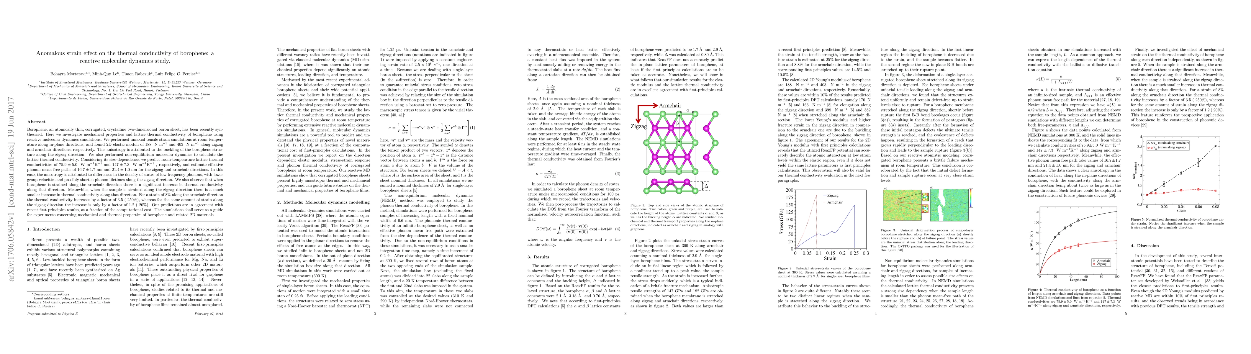 This study uses reactive molecular dynamics simulations to explore the mechanical properties and thermal conductivity of borophene under uniaxial tensile strain. The research finds significant anisotropy in thermal conductivity and mechanical moduli, with notable increases in thermal conductivity along the armchair direction under strain.