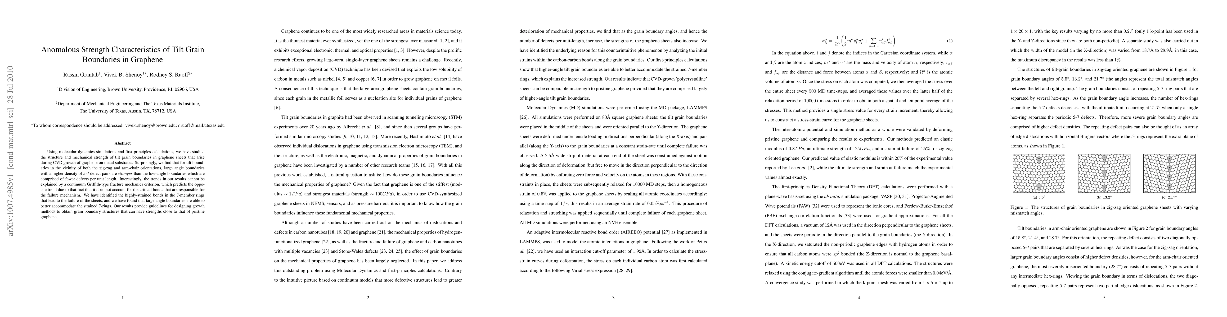 This study reveals that tilt grain boundaries in graphene, particularly those with higher defect densities, exhibit greater strength than low-angle boundaries, contrary to Griffith fracture mechanics predictions. The findings suggest large angle boundaries can better accommodate strained 7-member rings, offering insights for enhancing graphene growth techniques.