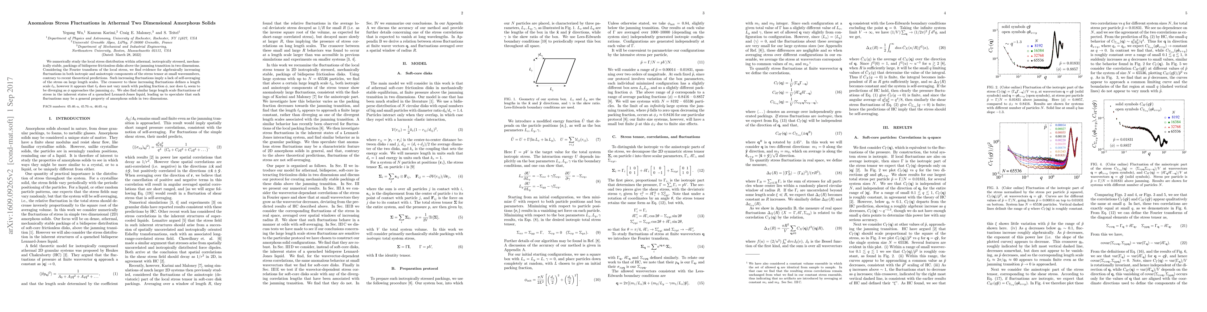 This paper investigates anomalous stress fluctuations in athermal, two-dimensional amorphous solids using numerical simulations. Contrary to theoretical predictions, it finds algebraically increasing fluctuations in local stress, indicating a lack of self-averaging on large length scales, with a constant crossover length scale that does not significantly change with packing fraction.
