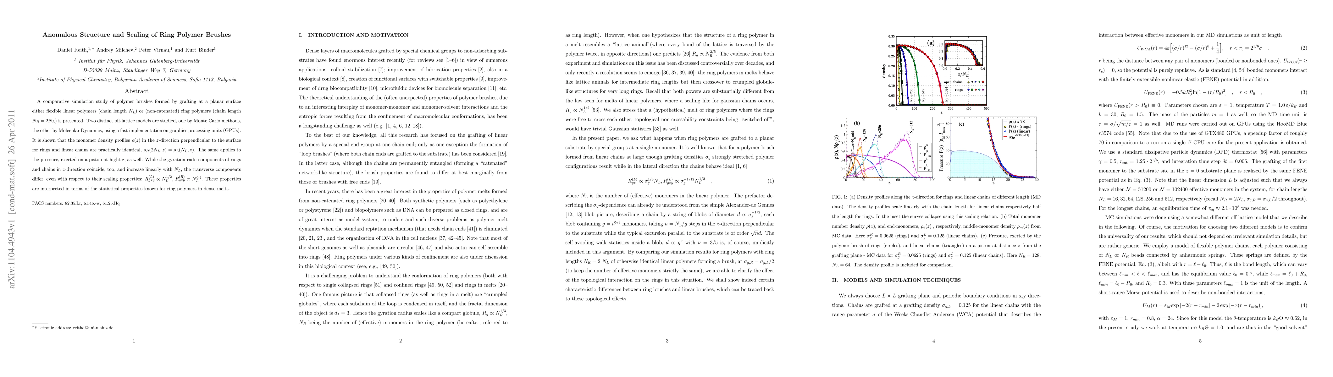 A comparative simulation study of polymer brushes formed by grafting at a planar surface either flexible linear polymers (chain length $N_L$) or (non-catenated) ring polymers (chain length $N_R=2 N_L$) is presented. Two distinct off-lattice models are studied, one by Monte Carlo methods, the other by Molecular Dynamics, using a fast implementation on graphics processing units (GPUs). It is shown that the monomer density profiles $\rho(z)$ in the $z$-direction perpendicular to the surface for rings and linear chains are practically identical, $\rho_R(2 N_L, z)=\rho_L(N_L, z)$. The same applies to the pressure, exerted on a piston at hight z, as well. While the gyration radii components of rings and chains in $z$-direction coincide, too, and increase linearly with $N_L$, the transverse components differ, even with respect to their scaling properties: $R_{gxy}^{(L)} \propto N_L^{1/2}$, $R_{gxy}^{(R)} \propto N_L^{0.4}$. These properties are interpreted in terms of the statistical properties known for ring polymers in dense melts.