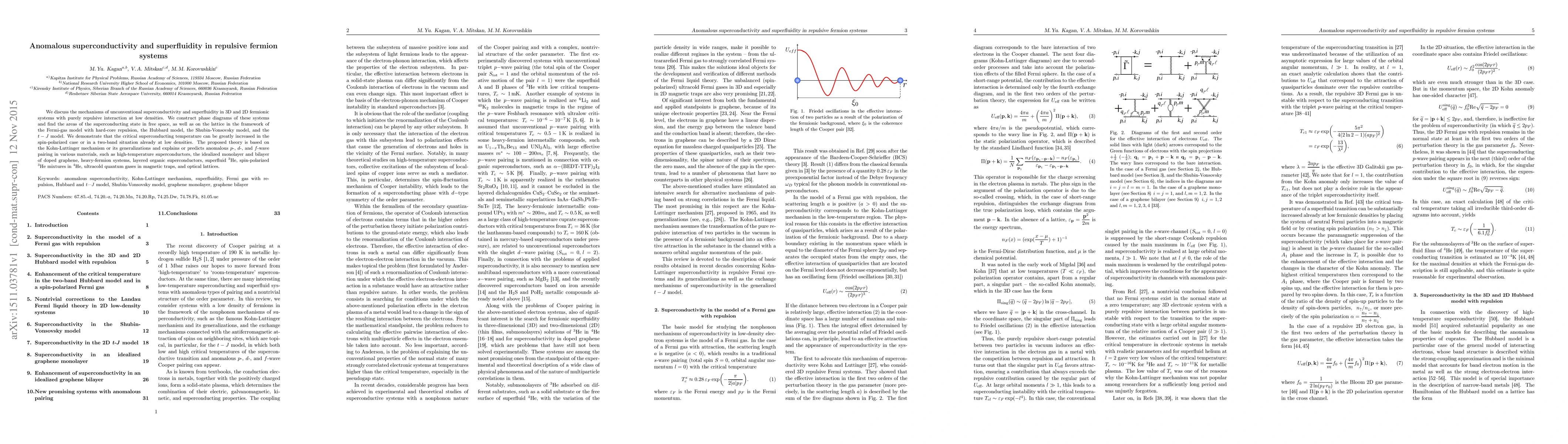 We discuss the mechanisms of unconventional superconductivity and superfluidity in 3D and 2D fermionic systems with purely repulsive interaction at low densities. We construct phase diagrams of these systems and find the areas of the superconducting state in free space, as well as on the lattice in the framework of the Fermi-gas model with hard-core repulsion, the Hubbard model, the Shubin-Vonsovsky model, and the $t-J$ model. We demonstrate that the critical superconducting temperature can be greatly increased in the spin-polarized case or in a two-band situation already at low densities. The proposed theory is based on the Kohn-Luttinger mechanism or its generalizations and explains or predicts anomalous $p$-, $d$-, and $f$-wave pairing in various materials, such as high-temperature superconductors, the idealized monolayer and bilayer of doped graphene, heavy-fermion systems, layered organic superconductors, superfluid $^3$He, spin-polarized $^3$He mixtures in $^4$He, ultracold quantum gases in magnetic traps, and optical lattices.
