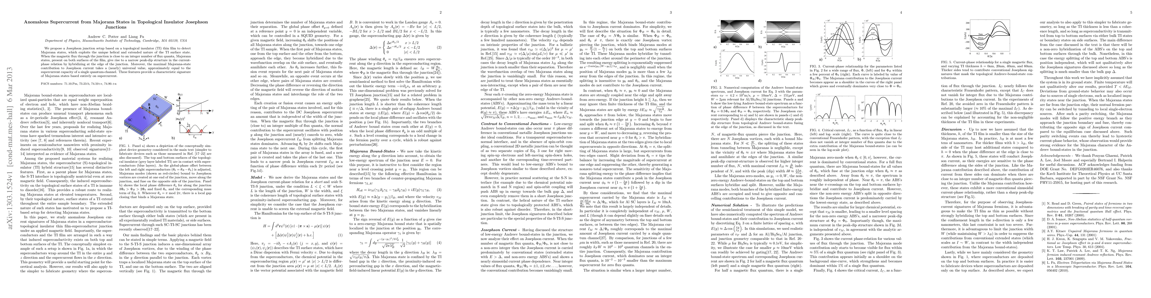 This paper proposes a Josephson junction setup using a topological insulator thin film to detect Majorana states, revealing a unique peak-dip structure in the current-phase relation when magnetic flux is near an integer flux quantum. The maximal Majorana-state contribution to the Josephson current is nearly universal, equal to the supercurrent capacity of a single quantum channel.