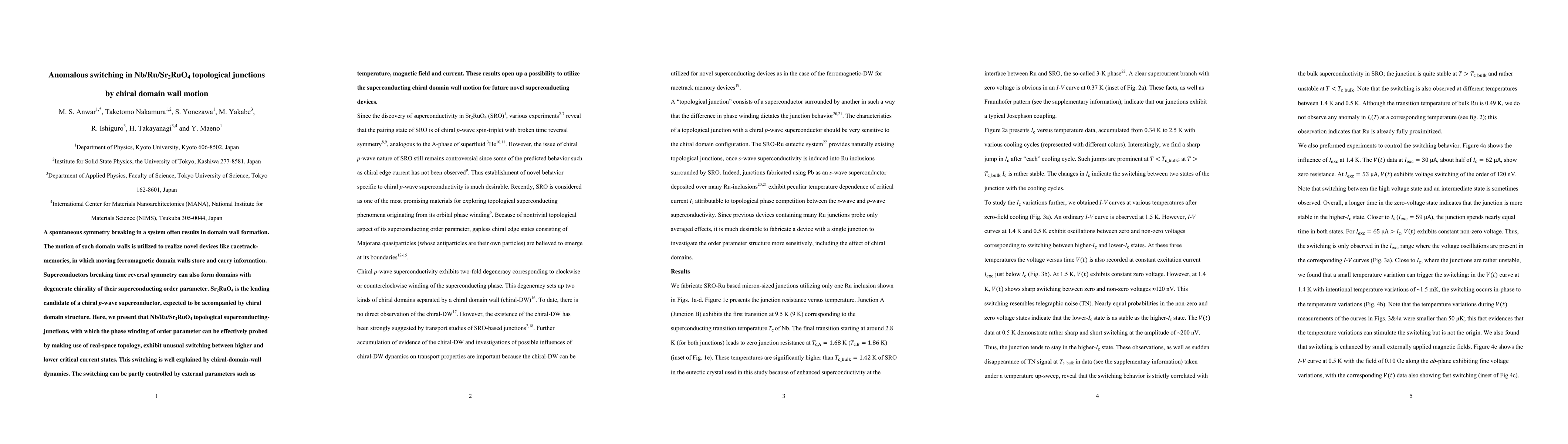 This paper investigates anomalous switching behaviors in Nb/Ru/Sr2RuO4 topological junctions, attributing the observed phenomena to chiral domain wall motion. The study suggests that domain wall dynamics can be manipulated by external factors, hinting at potential applications for novel superconducting devices.
