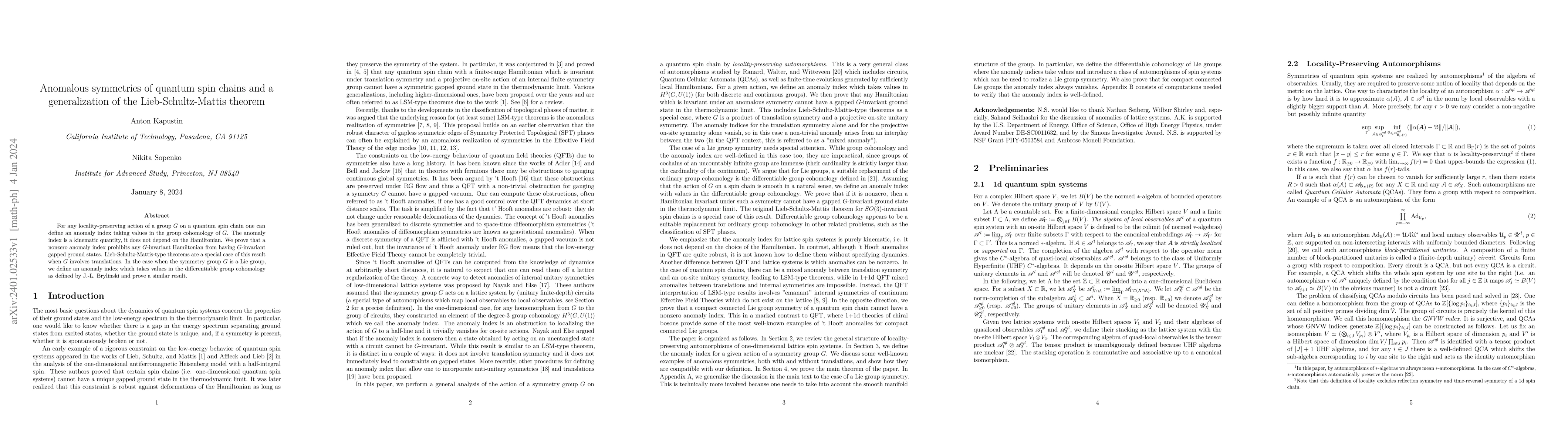 For any locality-preserving action of a group $G$ on a quantum spin chain one can define an anomaly index taking values in the group cohomology of $G$. The anomaly index is a kinematic quantity, it does not depend on the Hamiltonian. We prove that a nonzero anomaly index prohibits any $G$-invariant Hamiltonian from having $G$-invariant gapped ground states. Lieb-Schultz-Mattis-type theorems are a special case of this result when $G$ involves translations. In the case when the symmetry group $G$ is a Lie group, we define an anomaly index which takes values in the differentiable group cohomology as defined by J.-L. Brylinski and prove a similar result.