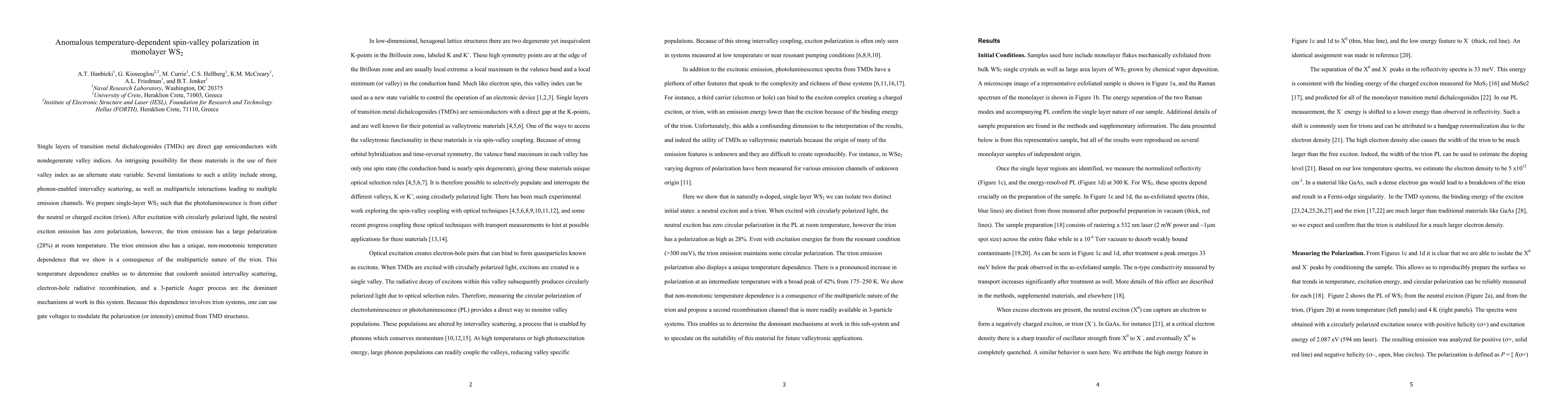 Single layers of transition metal dichalcogenides (TMDs) are direct gap semiconductors with nondegenerate valley indices. An intriguing possibility for these materials is the use of their valley index as an alternate state variable. Several limitations to such a utility include strong, phonon-enabled intervalley scattering, as well as multiparticle interactions leading to multiple emission channels. We prepare single-layer WS$_{2}$ such that the photoluminescence is from either the neutral or charged exciton (trion). After excitation with circularly polarized light, the neutral exciton emission has zero polarization, however, the trion emission has a large polarization (28%) at room temperature. The trion emission also has a unique, non-monotonic temperature dependence that we show is a consequence of the multiparticle nature of the trion. This temperature dependence enables us to determine that coulomb assisted intervalley scattering, electron-hole radiative recombination, and a 3-particle Auger process are the dominant mechanisms at work in this system. Because this dependence involves trion systems, one can use gate voltages to modulate the polarization (or intensity) emitted from TMD structures.