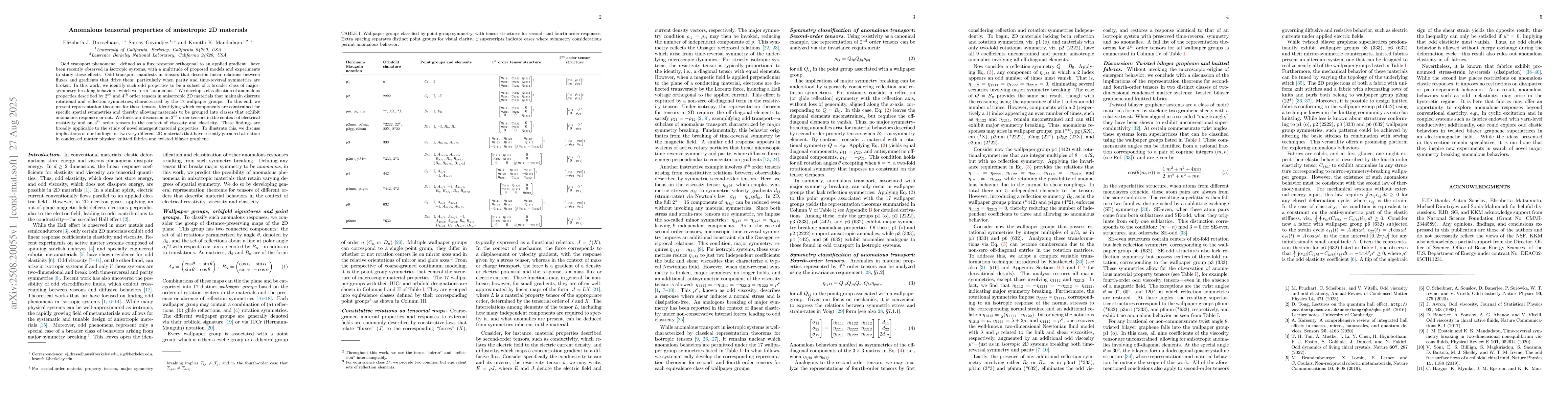 Odd transport phenomena -- defined as a flux response orthogonal to an applied gradient -- have been recently observed in isotropic systems, with a multitude of proposed models and experiments to study these effects. Odd transport manifests in tensors that describe linear relations between fluxes and gradients that drive them, particularly when parity and time-reversal symmetries are broken. In this work, we identify such odd properties to be a subset of a broader class of major-symmetry-breaking behaviors, which we term ``anomalous." We develop a classification of anomalous properties described by $2^\mathrm{nd}$ and $4^\mathrm{th}$ order tensors in anisotropic 2D materials that maintain discrete rotational and reflection symmetries, characterized by the 17 wallpaper groups. To this end, we present representation theorems for these tensors, identifying which components are constrained for specific spatial symmetries and thereby allowing materials to be grouped into classes that exhibit anomalous responses or not. We focus our discussion on $2^\mathrm{nd}$ order tensors in the context of electrical resistivity and on $4^\mathrm{th}$ order tensors in the context of viscosity and elasticity. These findings are broadly applicable to the study of novel emergent material properties. To illustrate this, we discuss implications of our findings for two very different 2D materials that have recently garnered attention in condensed matter physics: knitted fabrics and twisted bilayer graphene.