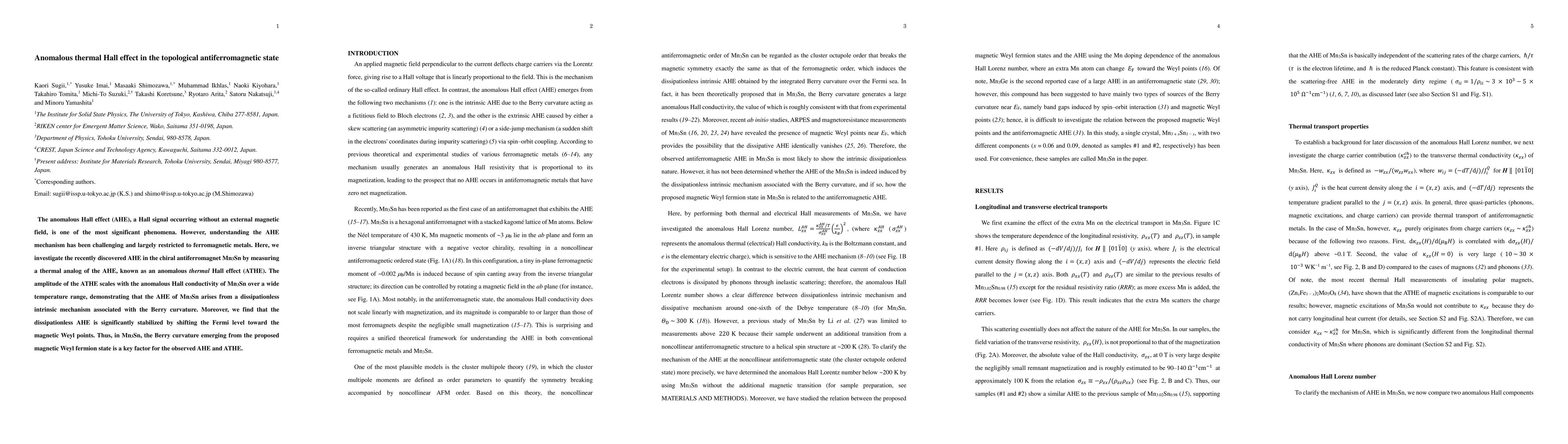 The anomalous Hall effect (AHE), a Hall signal occurring without an external magnetic field, is one of the most significant phenomena. However, understanding the AHE mechanism has been challenging and largely restricted to ferromagnetic metals. Here, we investigate the recently discovered AHE in the chiral antiferromagnet Mn3Sn by measuring a thermal analog of the AHE, known as an anomalous thermal Hall effect (ATHE). The amplitude of the ATHE scales with the anomalous Hall conductivity of Mn3Sn over a wide temperature range, demonstrating that the AHE of Mn3Sn arises from a dissipationless intrinsic mechanism associated with the Berry curvature. Moreover, we find that the dissipationless AHE is significantly stabilized by shifting the Fermi level toward the magnetic Weyl points. Thus, in Mn3Sn, the Berry curvature emerging from the proposed magnetic Weyl fermion state is a key factor for the observed AHE and ATHE.