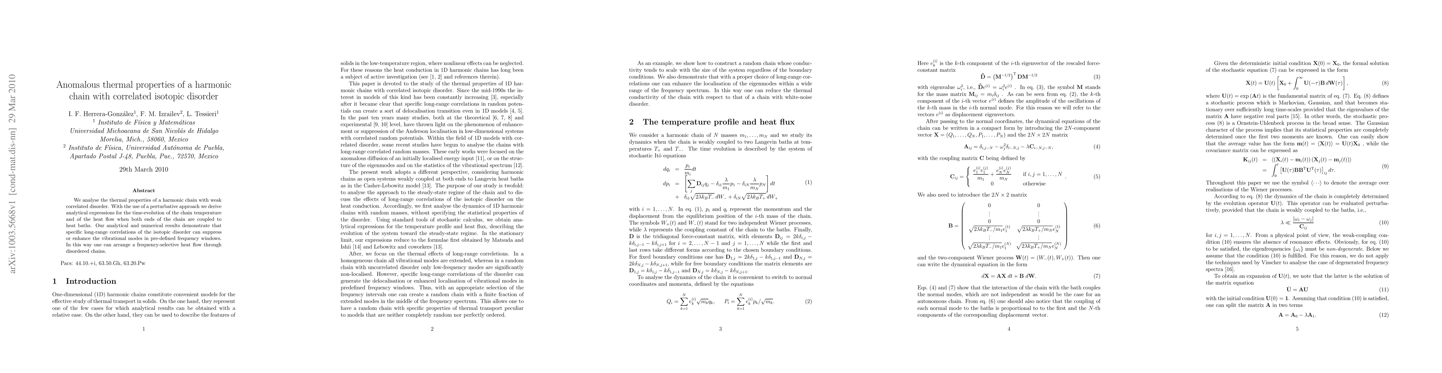 This paper investigates the thermal properties of a harmonic chain with correlated isotopic disorder, deriving analytical expressions for temperature and heat flow. The study finds that specific long-range correlations in the disorder can selectively suppress or enhance vibrational modes, enabling frequency-selective heat flow through the chain.