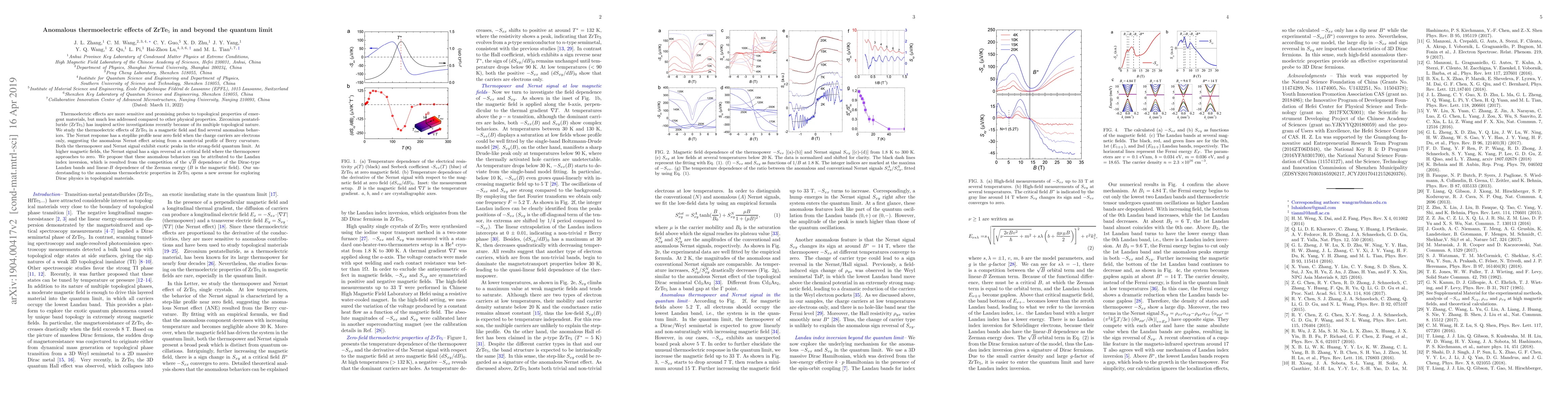 This paper investigates the thermoelectric effects in ZrTe$_{5}$ under magnetic fields, revealing anomalous behaviors such as steplike Nernst response and exotic peaks in the quantum limit, attributed to Landau index inversion due to competing Dirac-type Landau bands and Zeeman energy. These findings provide new insights into Dirac physics in topological materials.
